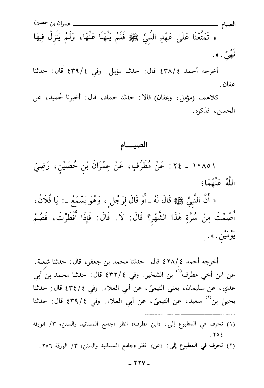 ١٠٨٥١ - عَنْ مُطَرِّفٍ، عَنْ عِمْرَانَ بْنِ حُصَيْنٍ، رَضِيَ اللهُ عَنْهُمَا؛