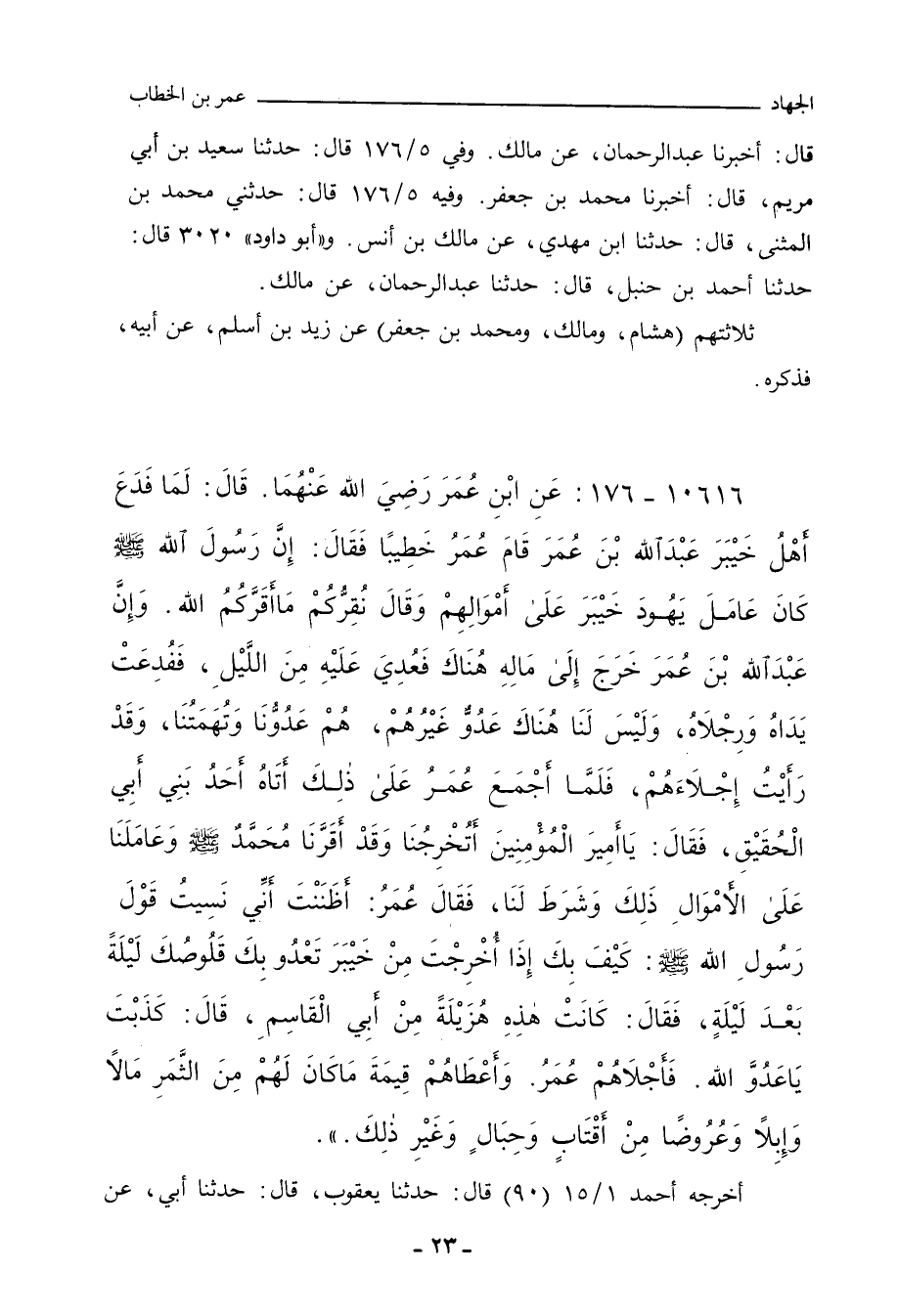 - وفي رواية: عَنْ عَبْدِ اللهِ بْنِ عُمَرَ، قَالَ: خَرَجْتُ أَنَا وَالزُّبَيْرُ وَالْمِقْدَادُ بْنُ الأَسْوَدِ إِلَى أَمْوَالِنَا بِخَيْبَرَ، نَتَعَاهَدُهَا، فَلَمَّا قَدِمِنْاهَا تَفَرَّقْنَا فِي أَمْوَالِنَا، قَالَ: فَعُدِيَ عَلَيَّ تَحْتَ اللَّيْلِ، وَأَنَا نَائِمٌ عَلَى فِرَاشِي، فَفُدِعَتْ يَدَايَ مِنْ مِرْفَقِي، فَلَمَّا أَصْبَحْتُ اسْتُصْرِخَ عَلَى صَاحِبَايَ، فَأَتَيَانِي، فَسَأَلَانِي عَمَّنْ صَنَعَ هَذَا بِكَ؟ قُلْتُ: لَا أَدْرِي، قَالَ: فَأَصْلَحَا مِنْ يَدَيَّ، ثُمَّ قَدِمُوا بِي عَلَى عُمَرَ، فَقَالَ: هَذَا عَمَلُ يَهُودَ، ثُمَّ قَامَ فِي النَّاسِ خَطِيبًا، فَقَالَ: أَيُّهَا النَّاسُ، إِنَّ رَسُولَ اللهِ صلى الله عليه وسلم كَانَ عَامَلَ يَهُودَ خَيْبَرَ عَلَى أَنَّا نُخْرِجُهُمْ إِذَا شِئْنَا، وَقَدْ عَدَوْا عَلَى عَبْدِ اللهِ بْنِ عُمَرَ، فَفَدَعُوا يَدَيْهِ كَمَا بَلَغَكُمْ، مَعَ عَدْوَتِهِمْ عَلَى الأَنْصَارِ قَبْلَهُ، لَا نَشُكُّ أَنَّهُمْ أَصْحَابُهُمْ، لَيْسَ لَنَا هُنَاكَ عَدُوٌّ غَيْرَهُمْ، فَمَنْ كَانَ لَهُ مَالٌ بِخَيْبَرَ فَلْيَلْحَقْ بِهِ، فَإِنِّي مُخْرِجٌ يَهُودَ، فَأَخْرَجَهُمْ.