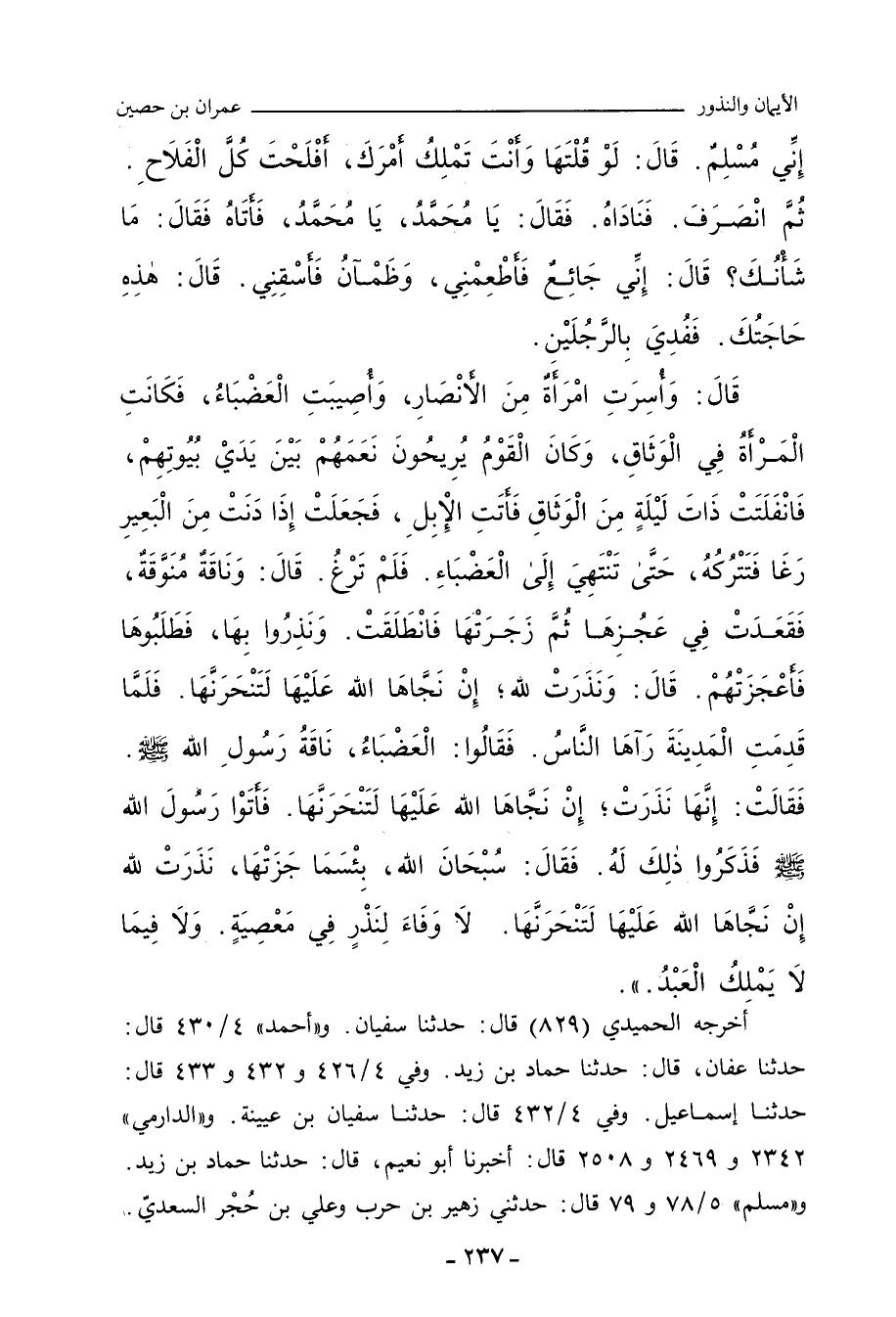 فَطَلَبُوهَا، فَأَعْجَزَتْهُمْ، قَالَ: وَنَذَرَتْ ِللهِ، إِنْ نَجَّاهَا اللهُ عَلَيْهَا لَتَنْحَرَنَّهَا، فَلَمَّا قَدِمَتِ الْمَدِينَةَ رَآهَا النَّاسُ، فَقَالُوا: الْعَضْبَاءُ، نَاقَةُ رَسُولِ اللهِ صلى الله عليه وسلم، فَقَالَتْ: إِنَّهَا نَذَرَتْ، إِنْ نَجَّاهَا اللهُ عَلَيْهَا لَتَنْحَرَنَّهَا، فَأَتَوْا رَسُولَ اللهِ صلى الله عليه وسلم، فَذَكَرُوا ذَلِكَ لَهُ، فَقَالَ: سُبْحَانَ اللهِ، بِئْسَمَا جَزَتْهَا، نَذَرَتْ ِللهِ، إِنْ نَجَّاهَا اللهُ عَلَيْهَا لَتَنْحَرَنَّهَا، لَا وَفَاءَ لِنَذْرٍ فِي مَعْصِيَةٍ، وَلَا فِيمَا لَا يَمْلِكُ الْعَبْدُ.