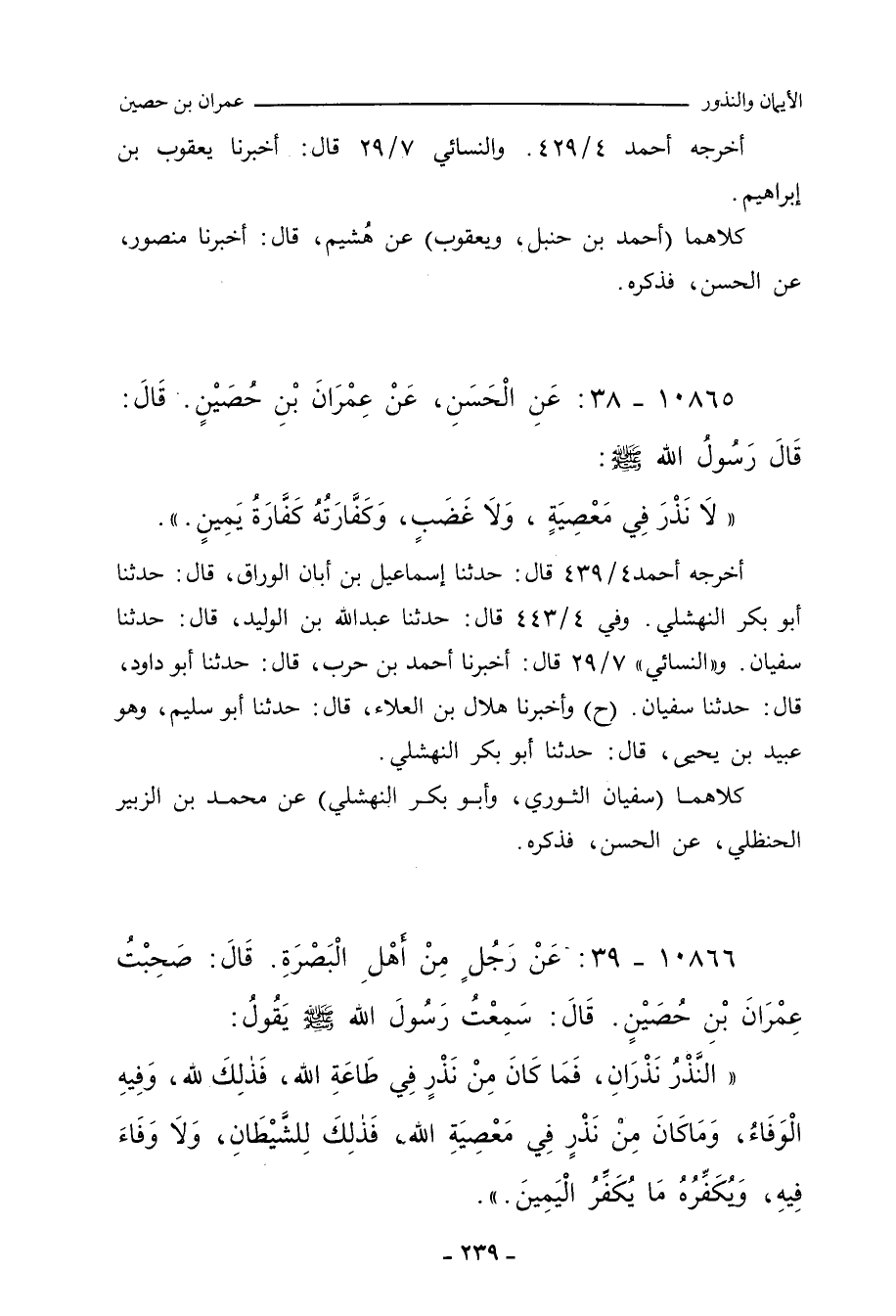 كلاهما (أحمد بن حَنْبل، ويَعْقُوب) عن هُشَيْم، قال: أنبأنا مَنْصُور، عن الحَسَن، فذكره.