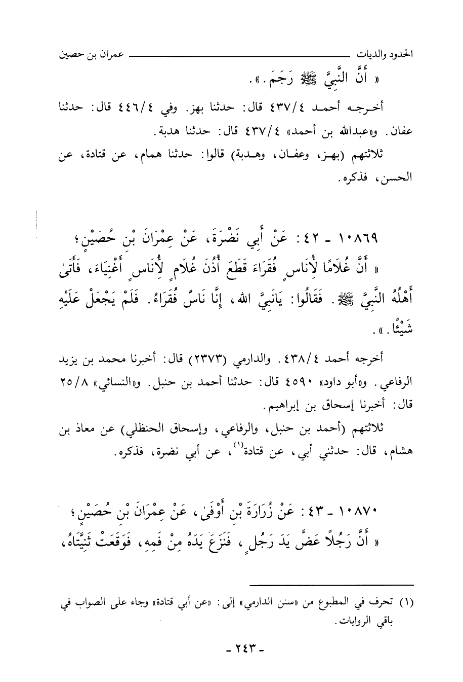 ١٠٨٦٩ - عَنْ أَبِي نَضْرَةَ، عَنْ عِمْرَانَ بْنِ حُصَيْنٍ؛