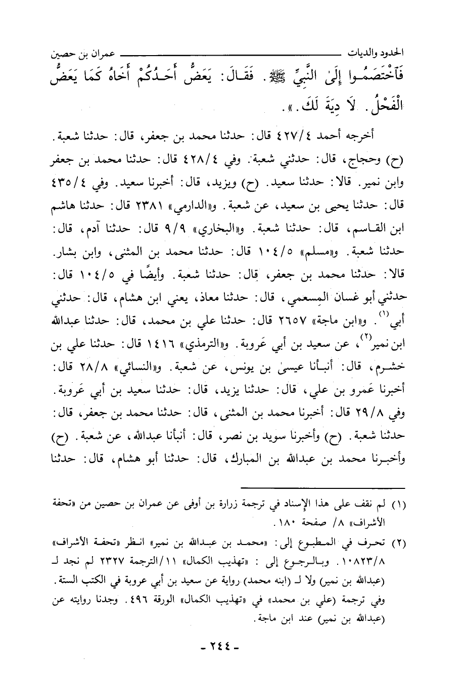 - وفي رواية: عَنْ عِمْرَانَ بْنِ حُصَيْنٍ، أَنَّ يَعْلَى قَالَ فِي الَّذِي عَضَّ، فَنَدَرَتْ ثَنِيَّتُهُ، أَنَّ النَّبِىَّ صلى الله عليه وسلم قَالَ: لَا دِيَةَ لَكَ. س ٨/ ٢٩ رواية سُوَيْد