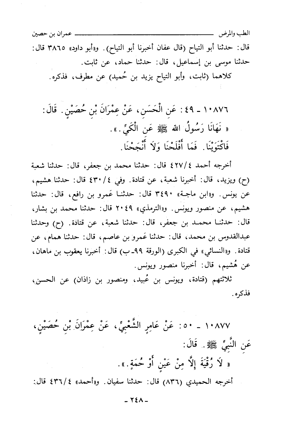 - وفي رواية: نُهِينَا عَنِ الْكَيِّ. ت رواية هَمَّام