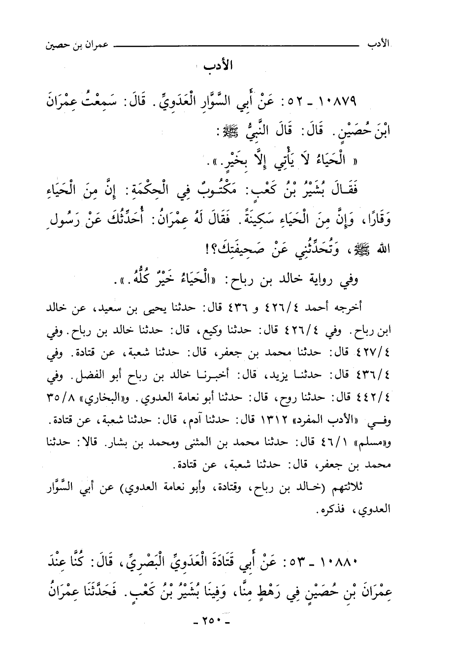 فَقَالَ بُشَيْرُ بْنُ كَعْبٍ: مَكْتُوبٌ فِي الْحِكْمَةِ: إِنَّ مِنَ الْحَيَاءِ وَقَارًا، وَإِنَّ مِنَ الْحَيَاءِ سَكِينَةً، فَقَالَ لَهُ عِمْرَانُ: أُحَدِّثُكَ عَنْ رَسُولِ اللهِ صلى الله عليه وسلم، وَتُحَدِّثُنِي عَنْ صَحِيفَتِكَ؟!. خ
