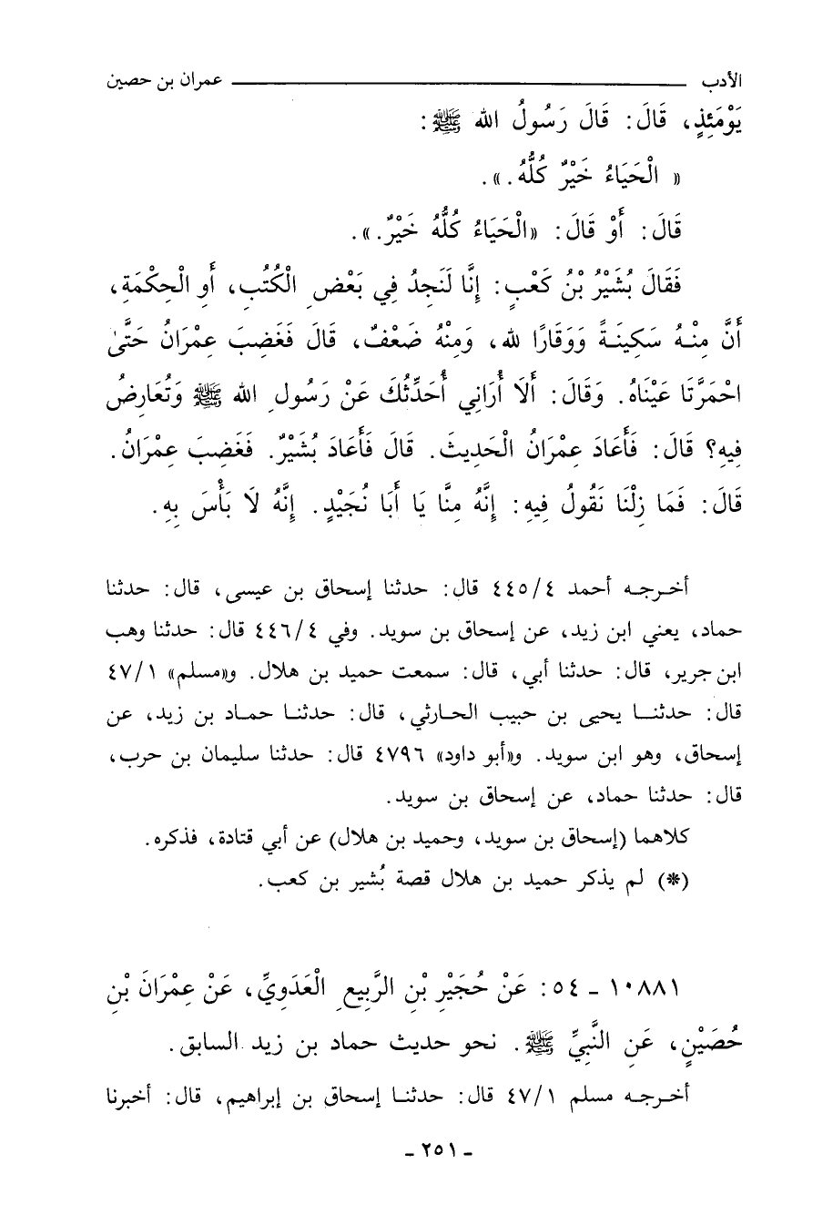 فَقَالَ بُشَيْرُ بْنُ كَعْبٍ: إِنَّا لَنَجِدُ فِي بَعْضِ الْكُتُبِ، أَوِالْحِكْمَةِ، أَنَّ مِنْهُ سَكِينَةً، وَوَقَارًا ِللهِ، وَمِنْهُ ضَعْفٌ، قَالَ: فَغَضِبَ عِمْرَانُ حَتَّى احْمَرَّتَا عَيْنَاهُ، وَقَالَ: أَلَا أُرَانِي أُحَدِّثُكَ عَنْ رَسولِ اللهِ صلى الله عليه وسلم وَتُعَارِضُ فِيهِ؟! قَالَ: فَأَعَادَ عِمْرَانُ الْحَدِيثَ، قَالَ: فَأَعَادَ بُشَيْرٌ، فَغَضِبَ عِمْرَانُ، قَالَ: فَمَا زِلْنَا نَقُولُ فِيهِ: إِنَّهُ مِنَّا يَا أَبَا نُجَيْدٍ، إِنَّهُ لَا بَأْسَ بِهِ. م