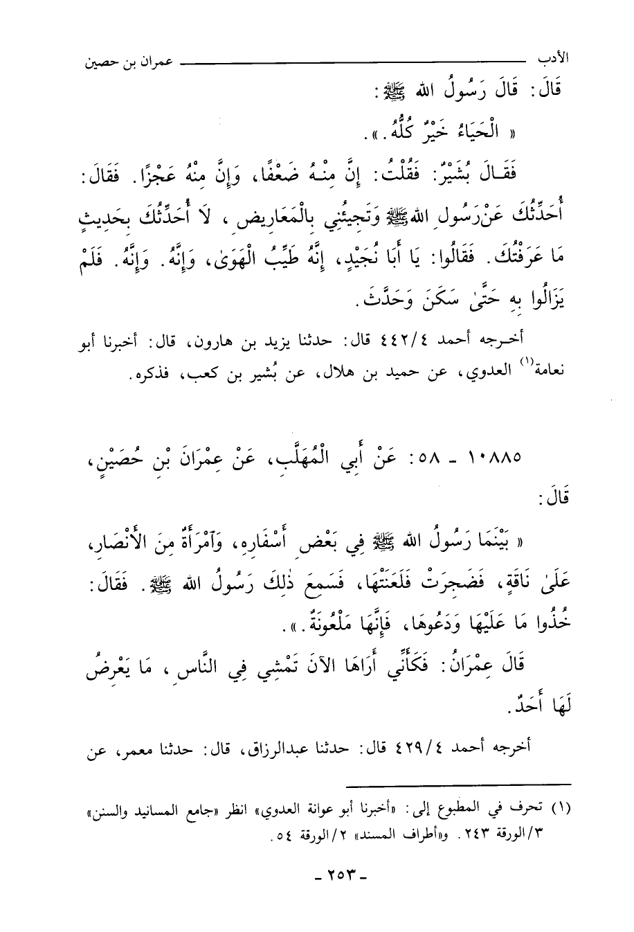 فَقَالَ بُشَيْرٌ: فَقُلْتُ: إِنَّ مِنْهُ ضَعْفًا، وَإِنَّ مِنْهُ عَجْزًا، فَقَالَ: أُحَدِّثُكَ عَنْ رَسُولِ اللهِ صلى الله عليه وسلم، وَتَجِيئُنِي بِالْمَعَارِيضِ، لَا أُحَدِّثُكَ بِحَدِيثٍ مَا عَرَفْتُكَ، فَقَالُوا: يَا أَبَا نُجَيْدٍ، إِنَّهُ طَيِّبُ الْهَوَى، وَإِنَّهُ، وَإِنَّهُ، فَلَمْ يَزَالُوا بِهِ حَتَّى سَكَنَ وَحَدَّثَ.