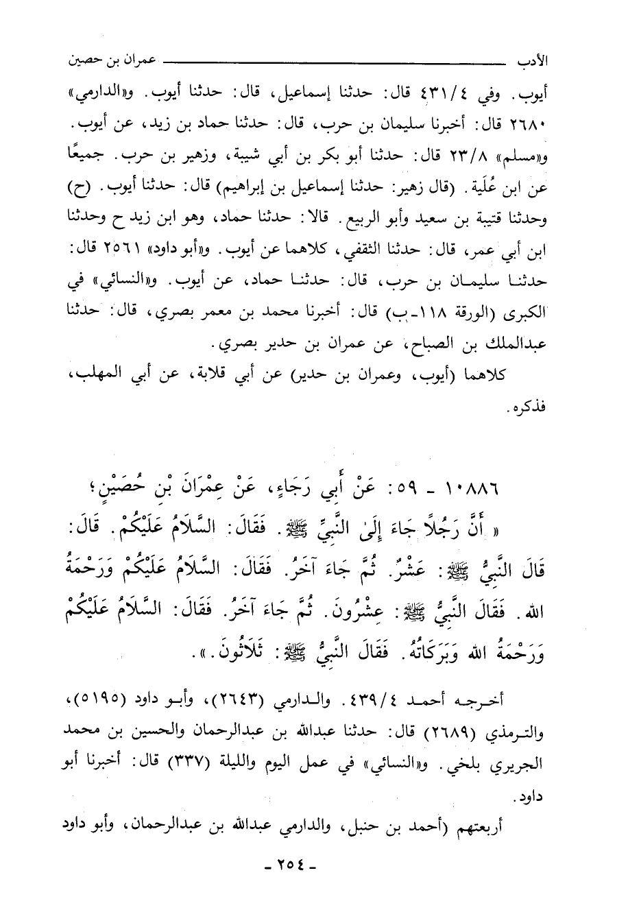 أَنَّ رَجُلاً جَاءَ إِلَى النَّبِيِّ صلى الله عليه وسلم، فَقَالَ: السَّلَامُ عَلَيْكُمْ، فَرَدَّ عَلَيْهِ، ثُمَّ جَلَسَ، فَقَالَ: عَشْرٌ، ثُمَّ جَاءَ آخَرُ، فَقَالَ: السَّلَامُ عَلَيْكُمْ وَرَحْمَةُ اللهِ، فَرَدَّ عَلَيْهِ، ثُمَّ جَلَسَ، فَقَالَ: عِشْرُونَ، ثُمَّ جَاءَ آخَرُ، فَقَالَ: السَّلَامُ عَلَيْكُمْ وَرَحْمَةُ اللهِ وَبَرَكَاتُهُ، فَرَدَّ عَلَيْهِ، ثُمَّ جَلَسَ، فَقَالَ: ثَلَاثُونَ.