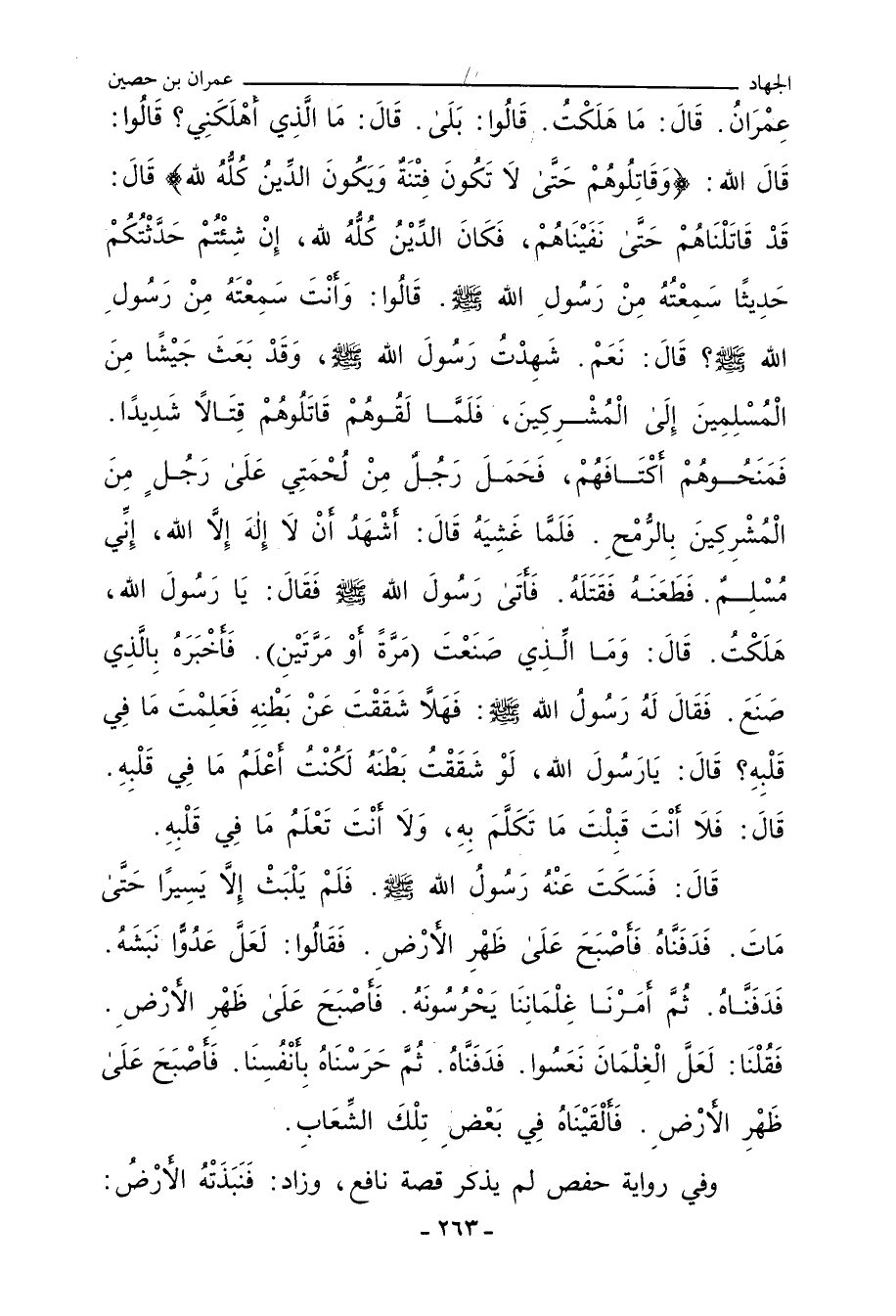 عِمْرَانُ، قَالَ: مَا هَلَكْتُ، قَالُوا: بَلَى، قَالَ: مَا الَّذِي أَهْلَكَنِي؟ قَالُوا: قَالَ اللهُ: ?وَقَاتِلُوهُمْ حَتَّى لَا تَكُونَ فِتْنَةٌ وَيَكُونَ الدِّينُ كُلُّهُ ِللهِ? قَالَ: قَدْ قَاتَلْنَاهُمْ حَتَّى نَفَيْنَاهُمْ، فَكَانَ الدِّينُ كُلُّهُ ِللهِ، إِنْ شِئْتُمْ حَدَّثْتُكُمْ حَدِيثًا سَمِعْتُهُ مِنْ رَسُولِ اللهِ صلى الله عليه وسلم، قَالُوا: وَأَنْتَ سَمِعْتَهُ مِنْ رَسُولِ اللهِ صلى الله عليه وسلم؟ قَالَ: نَعَمْ؛
