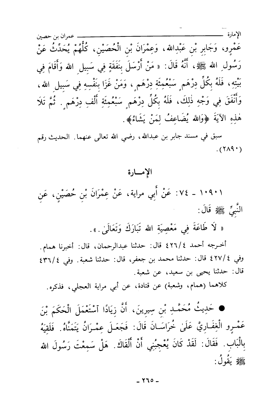 ١٠٩٠١ - عَنْ أَبِي مِرَايَةَ، عَنْ عِمْرَانَ بْنِ حُصَيْنٍ، عَنِ النَّبِيِّ صلى الله عليه وسلم، قَالَ: