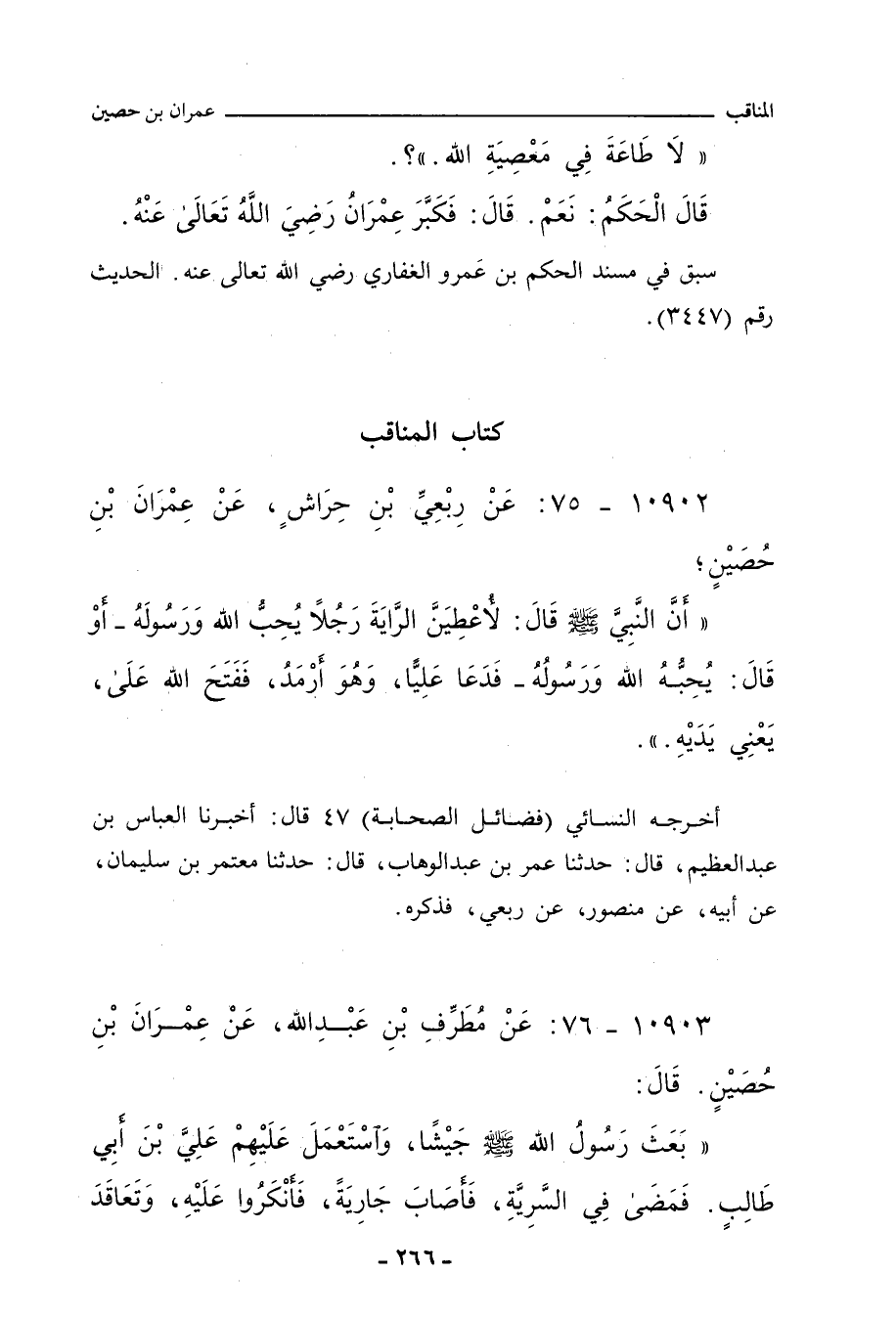 بَعَثَ رَسُولُ اللهِ صلى الله عليه وسلم سَرِيَّةً، وَأَمَّرَ عَلَيْهِمْ عَلِيَّ بْنَ أَبِي طَالِبٍ، رَضِيَ اللهُ تَعَالَى عَنْهُ، فَأَحْدَثَ شَيْئًا فِي سَفَرِهِ، فَتَعَاهَدَ - قَالَ عَفَّانُ: فَتَعَاقَدَ - أَرْبَعَةٌ مِنْ أَصْحَابِ مُحَمَّدٍ صلى الله عليه وسلم أَنْ يَذْكُرُوا أَمْرَهُ لِرَسُولِ اللهِ صلى الله عليه وسلم، قَالَ عِمْرَانُ: وَكُنَّا إِذَا قَدِمْنَا مِنْ سَفَرٍ بَدَأْنَا بِرَسُولِ اللهِ صلى الله عليه وسلم، فَسَلَّمْنَا عَلَيْهِ، قَالَ: فَدَخَلُوا عَلَيْهِ، فَقَامَ رَجُلٌ مِنْهُمْ، فَقَالَ: يَا رَسُولَ اللهِ، إِنَّ عَلِيًّا فَعَلَ كَذَا وَكَذَا، فَأَعْرَضَ عَنْهُ، ثُمَّ قَامَ الثَّانِي، فَقَالَ: يَا رَسُولَ اللهِ، إِنَّ عَلِيًّا فَعَلَ كَذَا وَكَذَا، فَأَعْرَضَ عَنْهُ، ثُمَّ قَامَ الثَّالِثُ، فَقَالَ: يَا رَسُولَ اللهِ، إِنَّ عَلِيًّا فَعَلَ كَذَا وَكَذَا، فَأَعْرَضَ عَنْهُ، ثُمَّ قَامَ الرَّابِعُ، فَقَالَ: يَا رَسُولَ اللهِ، إِنَّ عَلِيًّا فَعَلَ كَذَا وَكَذَا، قَالَ: فَأَقْبَلَ رَسُولُ اللهِ صلى الله عليه وسلم عَلَى الرَّابِعِ، وَقَدْ تَغَيَّرَ وَجْهُهُ، فَقَالَ: دَعُوا عَلِيًّا، دَعُوا عَلِيًّا، دَعُوا عَلِيًّا، إِنَّ عَلِيًّا مِنِّي وَأَنَا مِنْهُ، وَهُوَ وَلِيُّ كُلِّ مُؤْمِنٍ بَعْدِي.