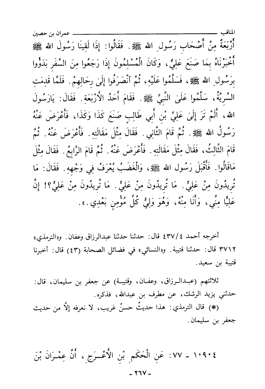 أَصْحَابُ رَسُولِ اللهِ صلى الله عليه وسلم، فَقَالُوا: إِذَا لَقِينَا رَسُولَ اللهِ صلى الله عليه وسلم أَخْبَرْنَاهُ بِمَا صَنَعَ عَلِيٌّ، قَالَ عِمْرَانُ: وَكَانَ الْمُسْلِمُونَ إِذَا قَدِمُوا مِنْ سَفَرٍ، بَدَؤُوا بِرَسُولِ اللهِ صلى الله عليه وسلم، فَسَلَّمُوا عَلَيْهِ، وَنَظَرُوا إِلَيْهِ، ثُمَّ يَنْصَرِفُونَ إِلَى رِحَالِهِمْ، فَلَمَّا قَدِمَتِ السَّرِيَّةُ، سَلَّمُوا عَلَى رَسُولِ اللهِ صلى الله عليه وسلم، فَقَامَ أَحَدُ الأَرْبَعَةِ، فَقَالَ: يَا رَسُولَ اللهِ، أَلَمْ تَرَ أَنَّ عَلِيًّا صَنَعَ كَذَا وَكَذَا، فَأَعْرَضَ عَنْهُ، ثُمَّ قَامَ آخَرُ، فَقَالَ: يَا رَسُولَ اللهِ، أَلَمْ تَرَ أَنَّ عَلِيًّا صَنَعَ كَذَا وَكَذَا، فَأَعْرَضَ عَنْهُ، ثُمَّ قَامَ آخَرُ، فَقَالَ: يَا رَسُولَ اللهِ، أَلَمْ تَرَ أَنَّ عَلِيًّا صَنَعَ كَذَا وَكَذَا، فَأَقْبَلَ إِلَيْهِ رَسُولُ اللهِ صلى الله عليه وسلم، وَالْغَضَبُ يُعْرَفُ فِي وَجْهِهِ، فَقَالَ: مَا تُرِيدُونَ مِنْ عَلِيٍّ، ثَلَاثًا، إِنَّ عَلِيًّا مِنِّي وَأَنَا مِنْهُ، وَهُوَ وَلِيُّ كُلِّ مُؤْمِنٍ بَعْدِي. حب