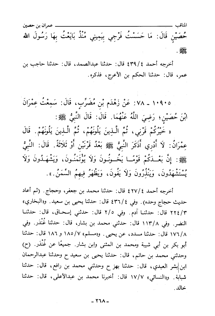 ١٠٩٠٥ - عَنْ زَهْدَمِ بْنِ مُضَرِّبٍ، قَالَ: سَمِعْتُ عِمْرَانَ بْنَ حُصَيْنٍ، رَضِيَ اللهُ عَنْهُمَا، قَالَ: قَالَ النَّبِيُّ صلى الله عليه وسلم: