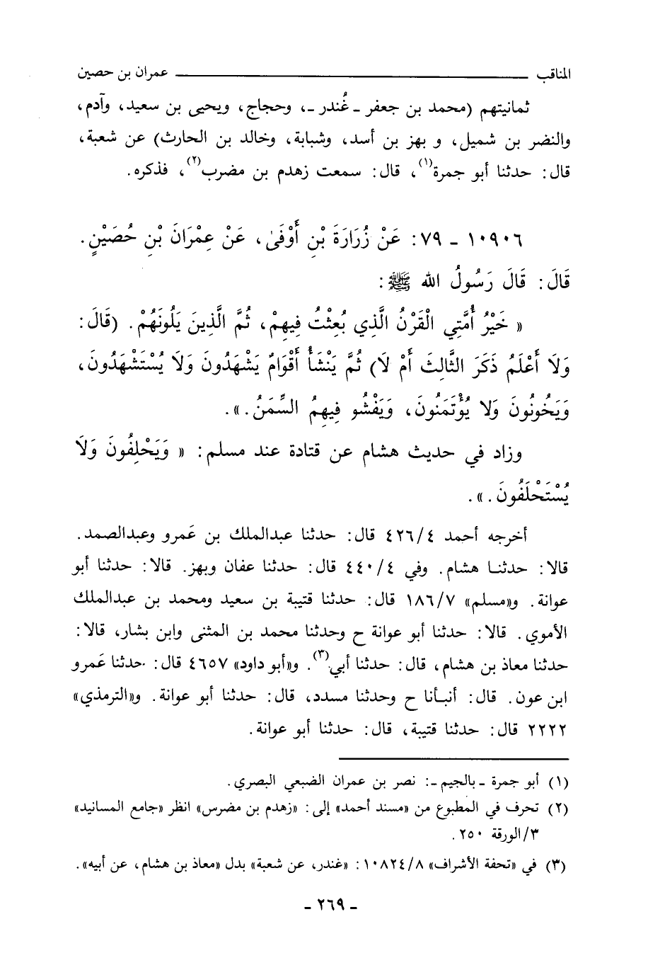 ١٠٩٠٦ - عَنْ زُرَارَةَ بْنِ أَوْفَى، عَنْ عِمْرَانَ بْنِ حُصَيْنٍ، قَالَ: قَالَ رَسُولُ اللهِ صلى الله عليه وسلم: