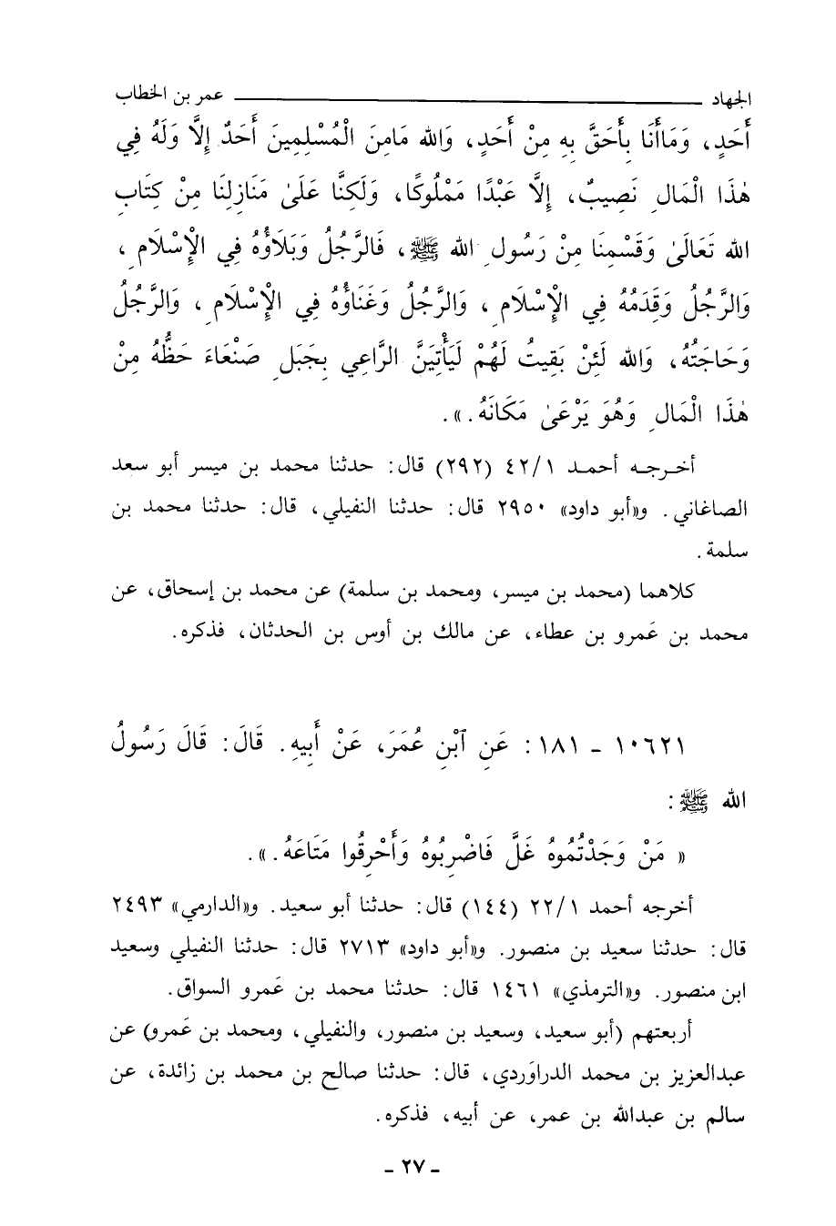- لفظ مُحَمد بن سَلَمَة:) ذَكَرَ عُمَرُ بْنُ الْخَطَّابِ يَوْمًا الْفَيْءَ، فَقَالَ: مَا أَنَا بِأَحَقَّ بِهَذَا الْفَيْءِ مِنْكُمْ، وَمَا أَحَدٌ مِنَّا بِأَحَقَّ بِهِ مِنْ أَحَدٍ، إِلَاّ أَنَّا عَلَى مَنَازِلِنَا مِنْ كِتَابِ اللهِ، عَزَّ وَجَلَّ، وَقَسْمِ رَسُولِ اللهِ صلى الله عليه وسلم، فَالرَّجُلُ وَقِدَمُهُ، وَالرَّجُلُ وَبَلَاؤُهُ، وَالرَّجُلُ وَعِيَالُهُ، وَالرَّجُلُ وَحَاجَتُهُ.