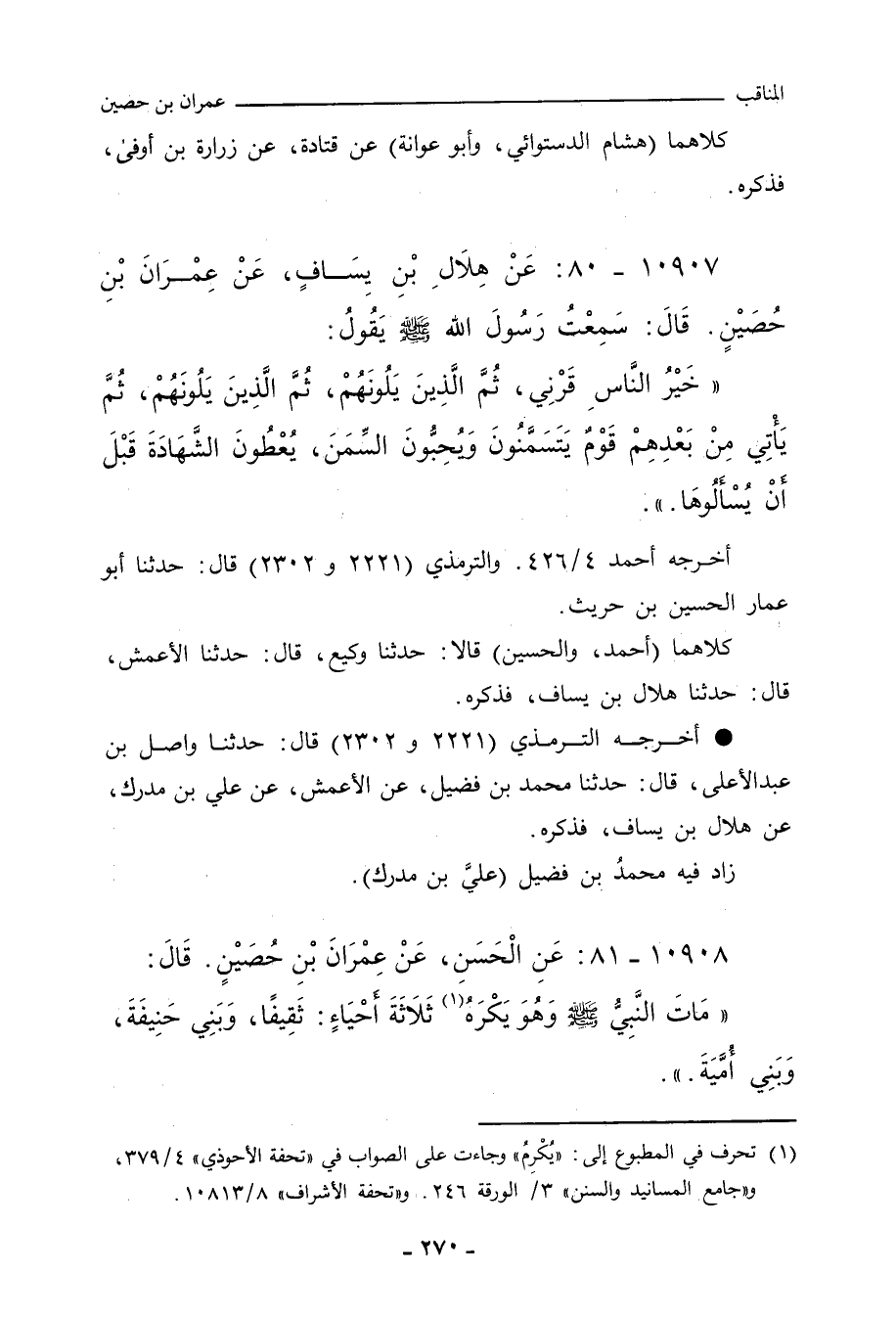 كلاهما (أحمد، والحُسَيْن) قالوا: حدَّثنا وَكِيع، حدَّثنا الأَعْمَش، حدَّثنا هِلَال بن يِسَاف، عَنْ عِمْرَانَ بْنِ حُصَيْنٍ، قَالَ: قَالَ رَسُولُ اللهِ صلى الله عليه وسلم: