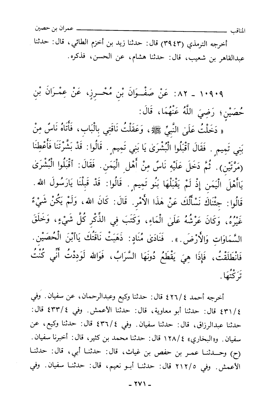 ١٠٩٠٩ - عَنْ صَفْوَانَ بْنِ مُحْرِزٍ، عَنْ عِمْرَانَ بْنِ حُصَيْنٍ، رَضيَ اللهُ عَنْهُمَا، قَالَ: