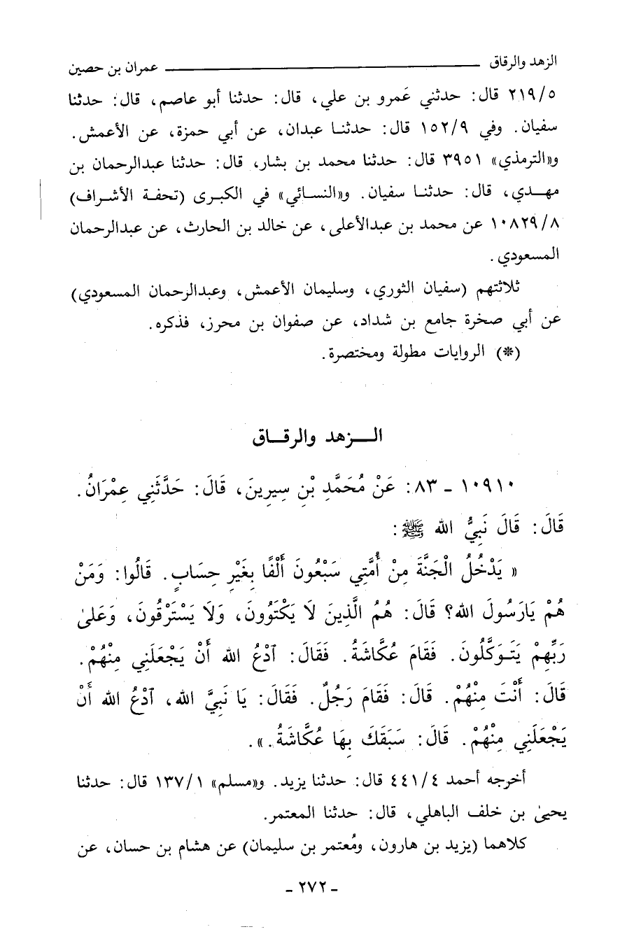 يَدْخُلُ الْجَنَّةَ مِنْ أُمَّتِي سَبْعُونَ أَلْفًا، بِغَيْرِ حِسَابٍ، قَالُوا: وَمَنْ هُمْ يَا رَسُولَ اللهِ؟ قَالَ: هُمُ الَّذِينَ لا يَكْتَوُونَ، وَلَا يَسْتَرْقُونَ، وَعَلَى رَبِّهِمْ يَتَوَكَّلُونَ، فَقَامَ عُكَّاشَةُ، فَقَالَ: ادْعُ اللهَ أَنْ يَجْعَلَنِي مِنْهُمْ، قَالَ: أَنْتَ مِنْهُمْ، قَالَ: فَقَامَ رَجُلٌ، فَقَالَ: يَا نَبِيَّ اللهِ، ادْعُ اللهَ أَنْ يَجْعَلَنِي مِنْهُمْ، قَالَ: سَبَقَكَ بهَا عُكَّاشَةُ.