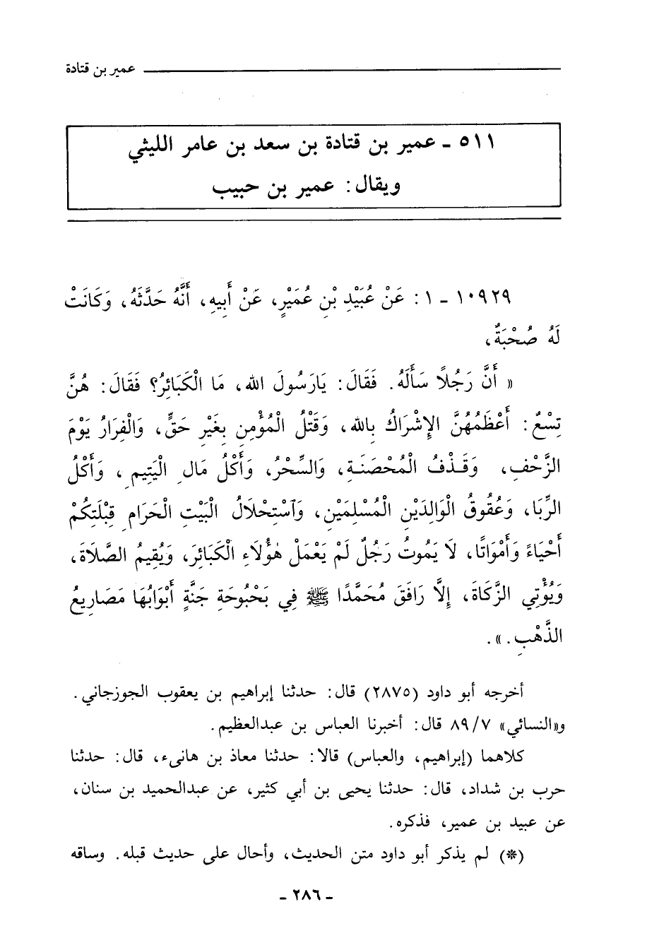 أَنَّ رَجُلاً سَأَلَهُ، فَقَالَ: يَا رَسُولَ اللهِ، مَا الْكَبَائِرُ؟ فَقَالَ: هُنَّ تِسْعٌ: أَعْظَمُهُنَّ الإِشْرَاكُ بِاللهِ، وَقَتْلُ الْمُؤْمِنِ بِغَيْرِ حَقٍّ، وَالْفِرَارُ يَوْمَ الزَّحْفِ، وَقَذْفُ الْمُحْصَنَةِ، وَالسِّحْرُ، وَأَكْلُ مَالِ الْيَتِيمِ، وَأَكْلُ الرِّبَا، وَعُقُوقُ الْوَالِدَيْنِ الْمُسْلِمَيْنِ، وَاسْتِحْلَالُ الْبَيْتِ الْحَرَامِ قِبْلَتِكُمْ أَحْيَاءً وَأَمْوَاتًا، لَا يَمُوتُ رَجُلٌ لَمْ يَعْمَلْ هَؤُلَاءِ الْكَبَائِرَ، وَيُقِيمُ الصَّلَاةَ، وَيُؤْتِي الزَّكَاةَ، إِلَاّ رَافَقَ مُحَمَّدًا صلى الله عليه وسلم فِي بَحْبُوحَةِ جَنَّةٍ أَبْوَابُهَا مَصَارِيعُ الذَّهْبِ.