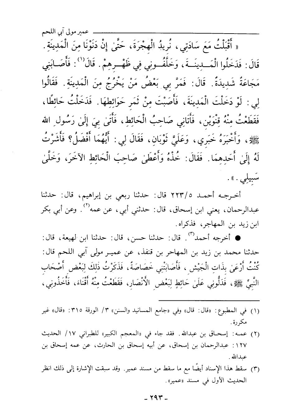 أخرجه أحمد (٢٤٣٠٢) قال: حدَّثنا حَسَن، حدَّثنا ابن لَهِيعَة، حدَّثنا مُحَمد بن زَيْد بن المُهَاجِر بن قُنْفُذ، عن عُمَيْر، مَوْلَى آبِي اللَّحْم، قال: