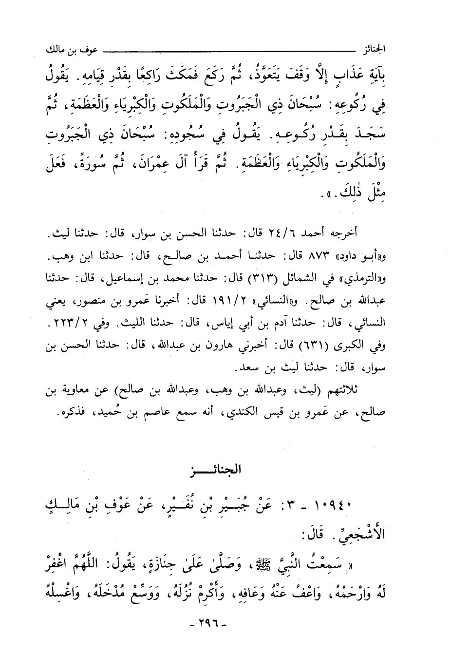 - وفي رواية: قُمْتُ مَعَ رَسُولِ اللهِ صلى الله عليه وسلم لَيْلَةً، فَلَمَّا رَكَعَ مَكَثَ قَدْرَ سُورَةِ الْبَقَرَةِ، يَقُولُ فِي رُكُوعِهِ: سُبْحَانَ ذِي الْجَبَرُوتِ وَالْمَلَكُوتِ، وَالْكِبْرِيَاءِ وَالْعَظَمَةِ. س ٢/ ١٩١