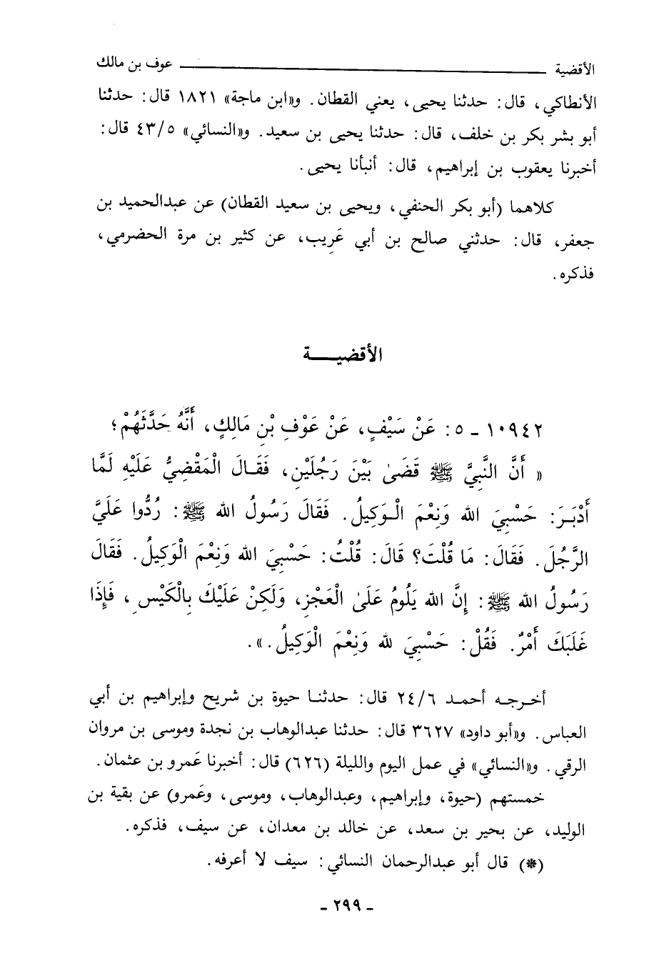 أَنَّ النَّبِيَّ صلى الله عليه وسلم قَضَى بَيْنَ رَجُلَيْنِ، فَقَالَ الْمَقْضِيُّ عَلَيْهِ لَمَّا أَدْبَرَ: حَسْبِيَ اللهُ وَنِعْمَ الْوَكِيلُ، فَقَالَ رَسُولُ اللهِ صلى الله عليه وسلم: رُدُّوا عَلَيَّ الرَّجُلَ، فَقَالَ: مَا قُلْتَ؟ قَالَ: قُلْتُ: حَسْبِيَ اللهُ وَنِعْمَ الْوَكِيلُ، فَقَالَ رَسُولُ اللهِ صلى الله عليه وسلم: إِنَّ اللهَ يَلُومُ عَلَى الْعَجْزِ، وَلَكِنْ عَلَيْكَ بِالْكَيْسِ، فَإِذَا غَلَبَكَ أَمْرٌ، فَقُلْ: حَسْبِيَ اللهُ وَنِعْمَ الْوَكِيلُ.