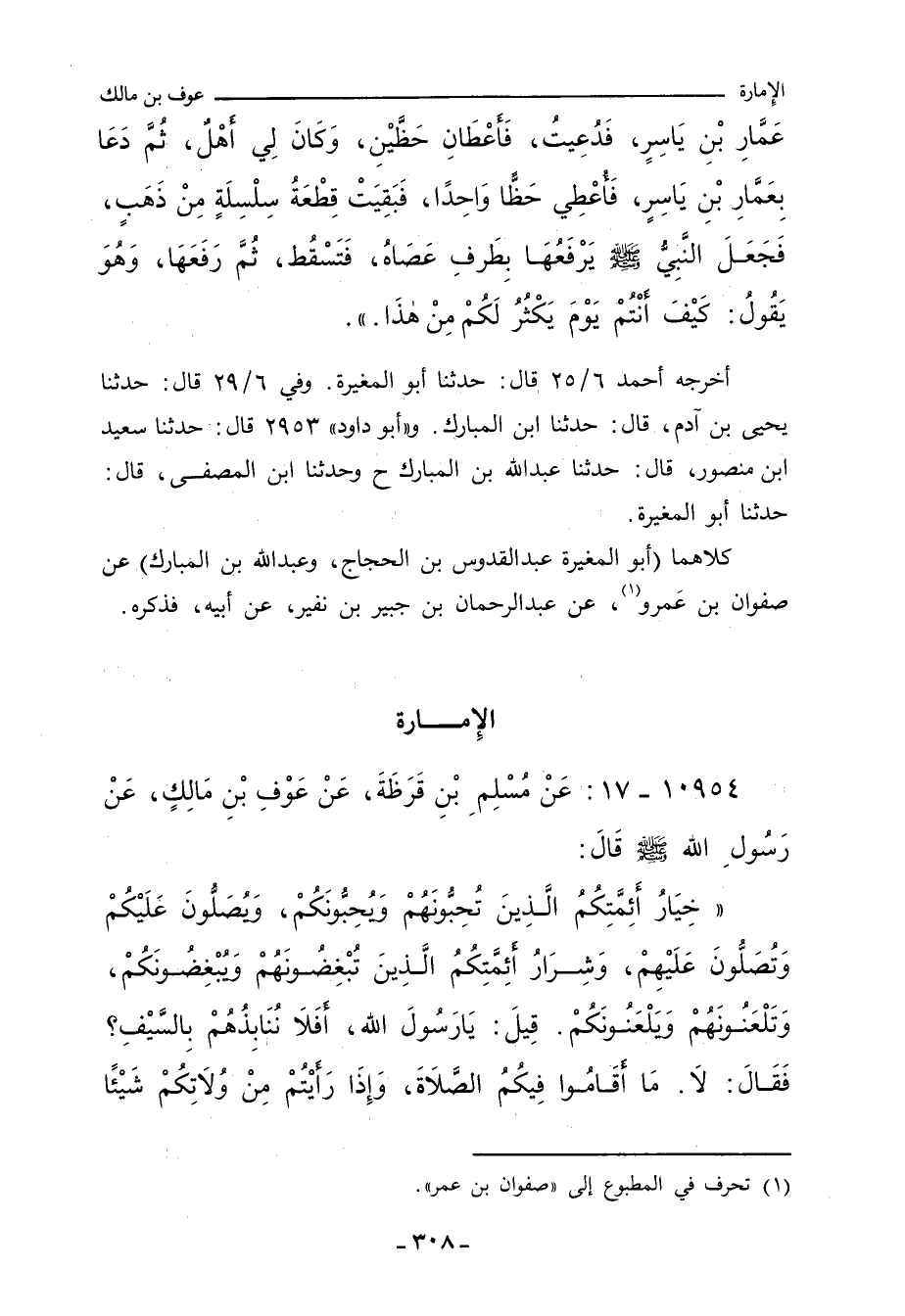 كلاهما (أبو المُغِيرَة، عَبْد القُدُّوس بن الحَجَّاج , وعَبْد الله بن المُبَارك) عن صَفْوَان بن عَمْرو، عن عَبْد الرَّحْمان بن جُبَيْر بن نُفَيْر، عن أبيه، فذكره.