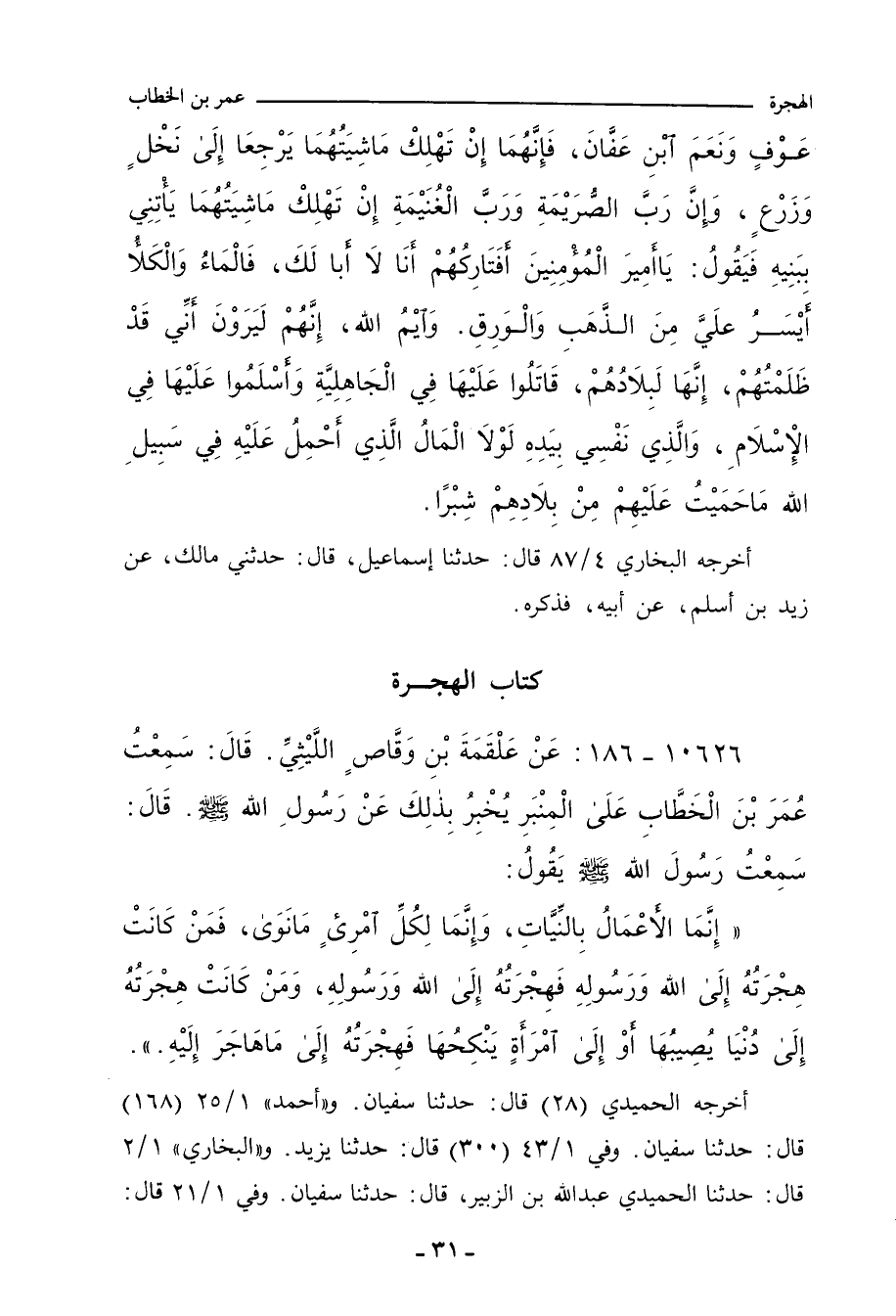 إِنَّمَا الأَعْمَالُ بِالنِّيَّاتِ، وَإِنَّمَا لِكُلِّ امْرِئٍ مَا نَوَى، فَمَنْ كَانَتْ هِجْرَتُهُ إِلَى اللهِ وَرَسُولِهِ، فَهِجْرَتُهُ إِلَى اللهِ وَرَسُولِهِ، وَمَنْ كَانَتْ هِجْرَتُهُ إِلَى دُنْيَا يُصِيبُهَا، أَوْ إِلَى امْرَأَةٍ يَنْكِحُهَا، فَهِجْرَتُهُ إِلَى مَا هَاجَرَ إِلَيْهِ. يد