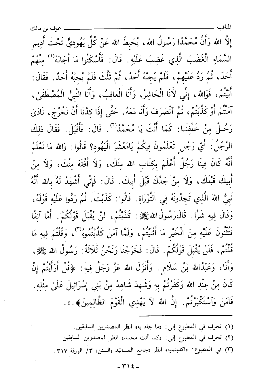 إِلَاّ اللهُ، وَأَنَّ مُحَمَّدًا رَسُولُ اللهِ، يُحْبِطِ اللهُ عَنْ كُلِّ يَهُودِيٍّ تَحْتَ أَدِيمِ السَّمَاءِ الْغَضَبَ الَّذِي غَضِبَ عَلَيْهِ، قَالَ: فَأَسْكَتُوا، مَا أَجَابَهُ مِنْهُمْ أَحَدٌ، ثُمَّ رَدَّ عَلَيْهِمْ، فَلَمْ يُجِبْهُ أَحَدٌ، ثُمَّ ثَلَّثَ، فَلَمْ يُجِبْهُ أَحَدٌ، فَقَالَ: أَبَيْتُمْ، فَوَاللهِ، إِنِّي لأَنَا الْحَاشِرُ، وَأَنَا الْعَاقِبُ، وَأَنَا النَّبِيُّ الْمُصْطَفَى، آمَنْتُمْ، أَوْ كَذَّبْتُمْ، ثُمَّ انْصَرَفَ وَأَنَا مَعَهُ، حَتَّى إِذَا كِدْنَا أَنْ نَخْرُجَ، نَادَى رَجُلٌ مِنْ خَلْفِنَا: كَمَا أَنْتَ يَا مُحَمَّدُ، قَالَ: فَأَقْبَلَ، فَقَالَ ذَلِكَ الرَّجُلُ: أَيَّ رَجُلٍ تَعْلَمُونَ فِيكُمْ، يَا مَعْشَرَ الْيَهُودِ؟ قَالُوا: وَاللهِ، مَا نَعْلَمُ أَنَّهُ كَانَ فِينَا رَجُلٌ أَعْلَمُ بِكِتَابِ اللهِ مِنْكَ، وَلَا أَفْقَهُ مِنْكَ، وَلَا مِنْ أَبِيكَ قَبْلَكَ، وَلَا مِنْ جَدِّكَ قَبْلَ أَبِيكَ، قَالَ: فَإِنِّي أَشْهَدُ لَهُ بِاللهِ أَنَّهُ نَبِيُّ اللهِ، الَّذِي تَجِدُونَهُ فِي التَّوْرَاةِ، قَالُوا: كَذَبْتَ، ثُمَّ رَدُّوا عَلَيْهِ قَوْلَهُ، وَقَالُوا فِيهِ شَرًّا، قَالَ رَسُولُ اللهِ صلى الله عليه وسلم: كَذَبْتُمْ، لَنْ يُقْبَلَ قَوْلُكُمْ، أَمَّا آنِفًا فَتُثْنُونَ عَلَيْهِ مِنَ الْخَيْرِ مَا أَثْنَيْتُمْ، وَلَمَّا آمَنَ