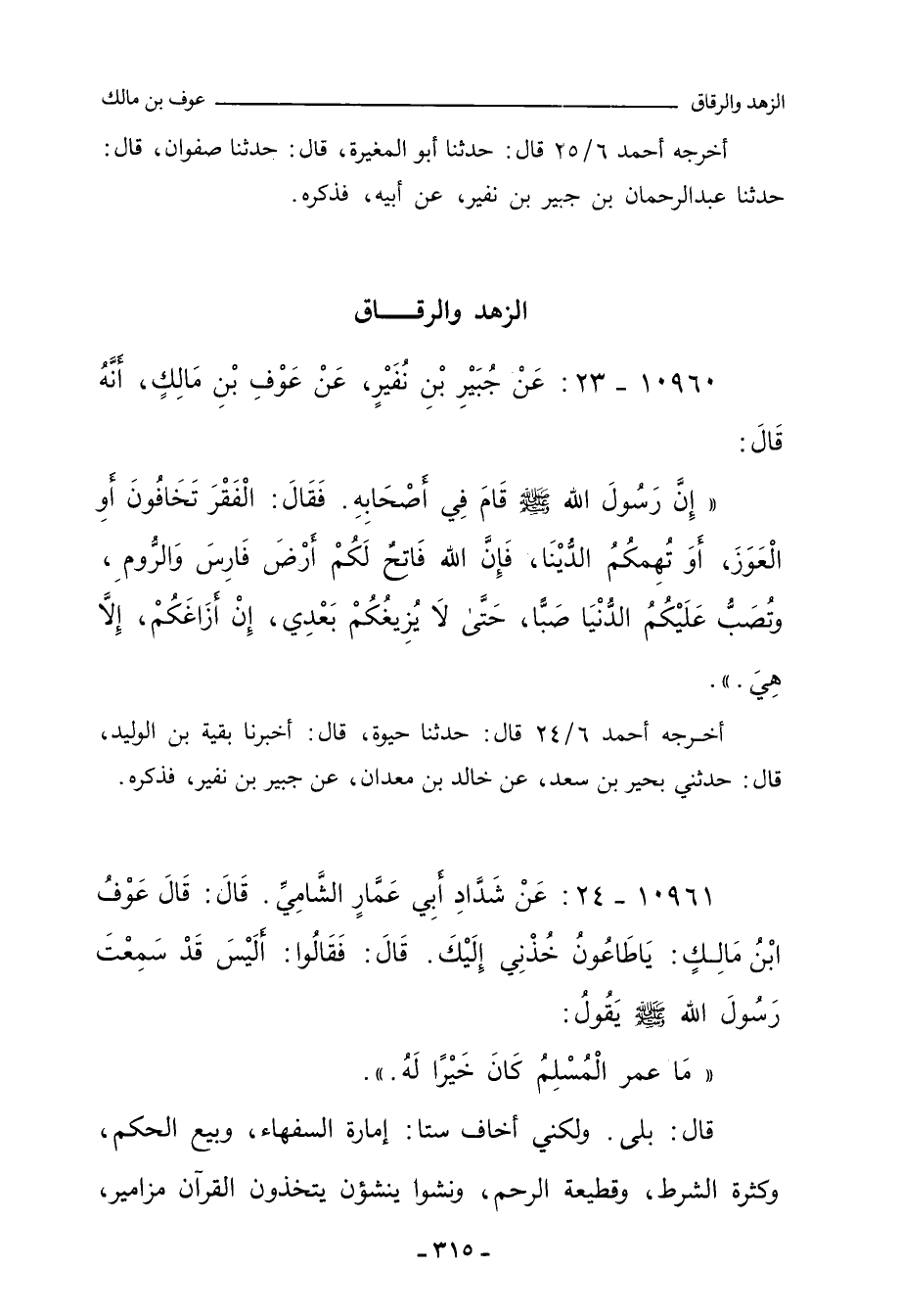 ١٠٩٦٠ - عَنْ جُبَيْرِ بْنِ نُفَيْرٍ، عَنْ عَوْفِ بْنِ مَالِكٍ، أَنَّهُ قَالَ: