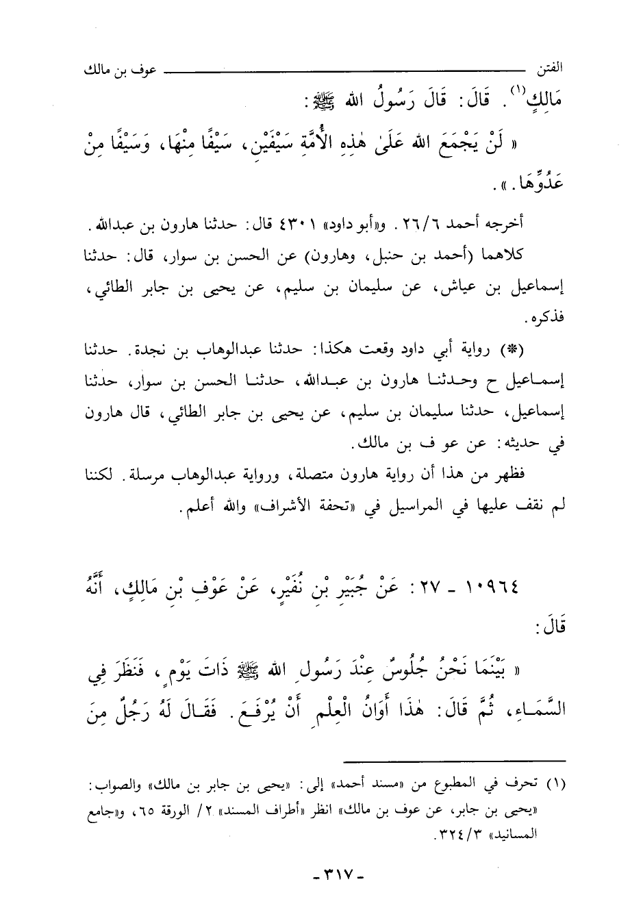 - في رواية أَبي داود وقعت هكذا: حدَّثنا عَبْد الوَهَّاب بن نَجْدَة، حدَّثنا إِسْمَاعِيل (ح) وحدَّثنا هارون بن عَبْد الله، حدَّثنا الحَسَن بن سَوَّار، حدَّثنا إِسْمَاعِيل، حدَّثنا سُلَيْمان بن سُلَيْم، عن يَحيى بن جابر الطَّائِي، قال هارون في حديثه: عن عَوْف بن مالك.