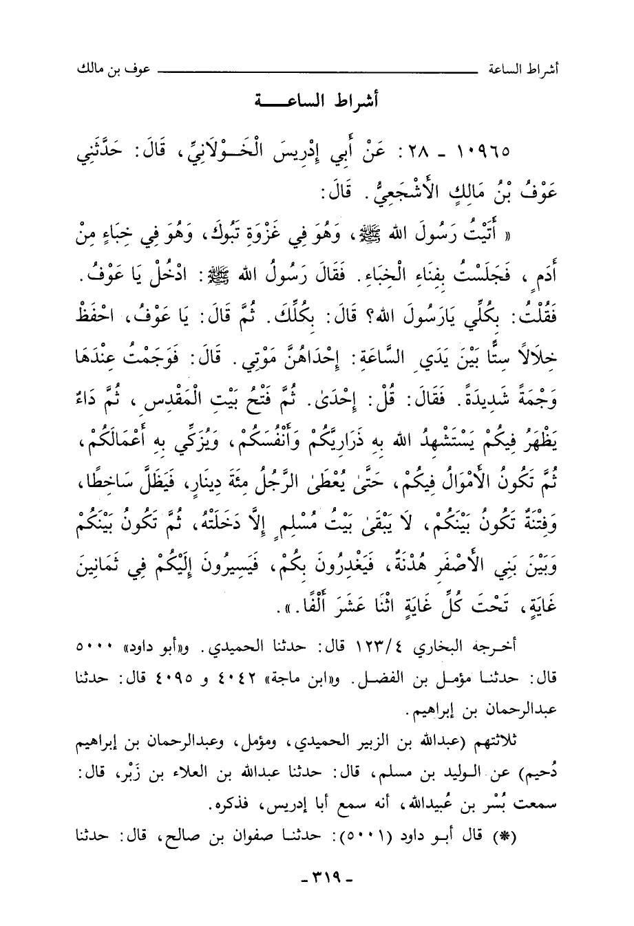 أَتَيْتُ رَسُولَ اللهِ صلى الله عليه وسلم، وَهُوَ فِي غَزْوَةِ تَبُوكَ، وَهُوَ فِي خِبَاءٍ مِنْ أَدَمٍ، فَجَلَسْتُ بِفِنَاءِ الْخِبَاءِ، فَقَالَ رَسُولُ اللهِ صلى الله عليه وسلم: ادْخُلْ يَا عَوْفُ، فَقُلْتُ: بِكُلِّي يَا رَسُولَ اللهِ؟ قَالَ: بِكُلِّكَ، ثُمَّ قَالَ: يَا عَوْفُ، احْفَظْ خِلَالاً سِتًّا بَيْنَ يَدَيِ السَّاعَةِ: إِحْدَاهُنَّ مَوْتِي، قَالَ: فَوَجَمْتُ عِنْدَهَا وَجْمَةً شَدِيدَةً، فَقَالَ: قُلْ: إِحْدَى، ثُمَّ فَتْحُ بَيْتِ الْمَقْدِسِ، ثُمَّ دَاءٌ يَظْهَرُ فِيكُمْ يَسْتَشْهِدُ اللهُ بِهِ ذَرَارِيَّكُمْ وَأَنْفُسَكُمْ، وَيُزَكِّي بِهِ أَعْمَالَكُمْ، ثُمَّ تَكُونُ الأَمْوَالُ فِيكُمْ، حَتَّى يُعْطَى الرَّجُلُ مِئَةَ دِينَارٍ، فَيَظَلَّ سَاخِطًا، وَفِتْنَةٌ تَكُونُ بَيْنَكُمْ، لَا يَبْقَى بَيْتُ مُسْلِمٍ إِلَاّ دَخَلَتْهُ، ثُمَّ تَكُونُ بَيْنَكُمْ وَبَيْنَ بَنِي الأَصْفَرِ هُدْنَةٌ، فَيَغْدِرُونَ بِكُمْ، فَيَسِيرُونَ إِلَيْكُمْ فِي ثَمَانِينَ غَايَةٍ، تَحْتَ كُلِّ غَايَةٍ اثْنَا عَشَرَ أَلْفًَا. ق (٤٠٤٢)