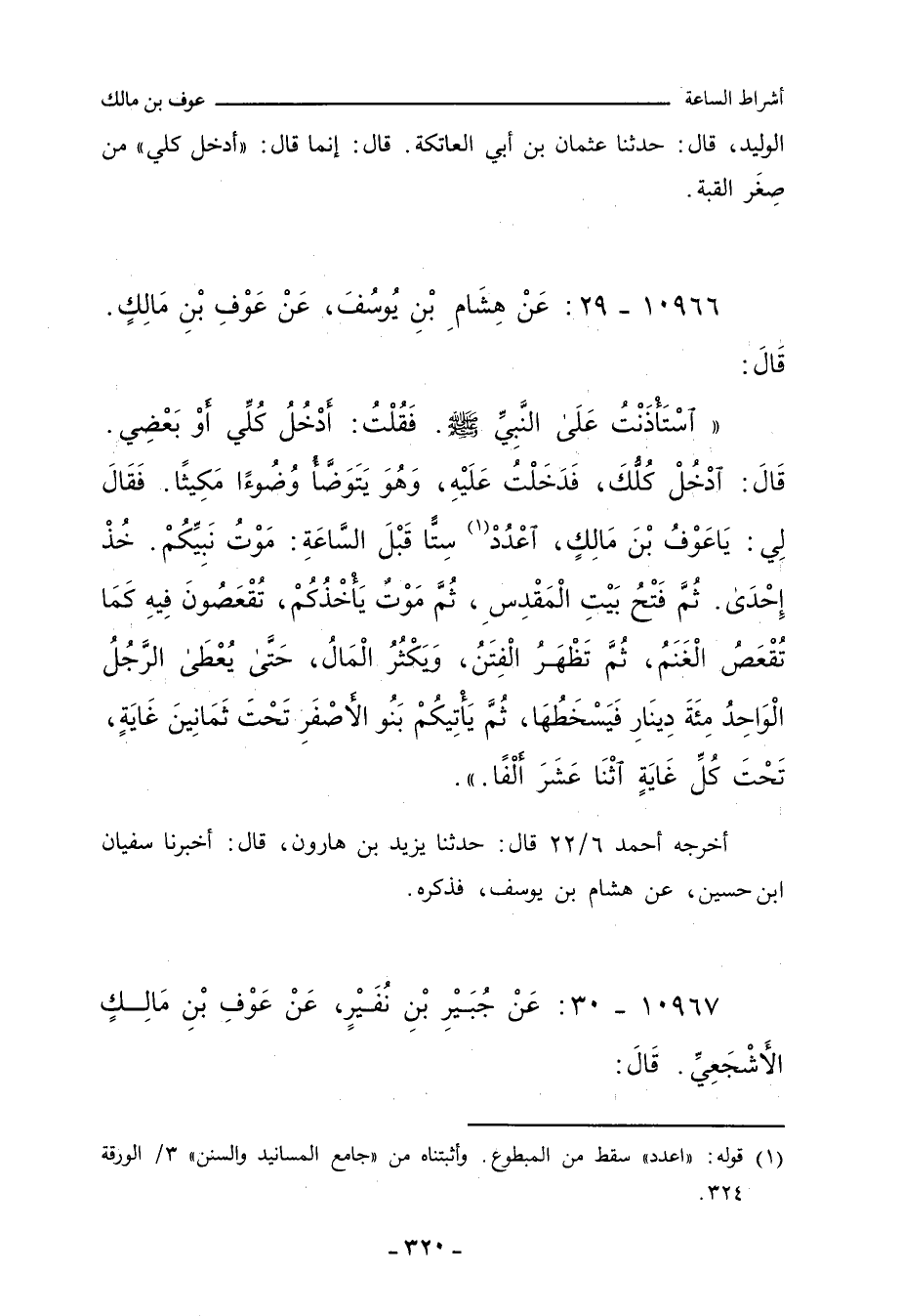 ١٠٩٦٧ - عَنْ جُبَيْرِ بْنِ نُفَيْرٍ، عَنْ عَوْفِ بْنِ مَالِكٍ الأَشْجَعِيِّ، قَالَ: