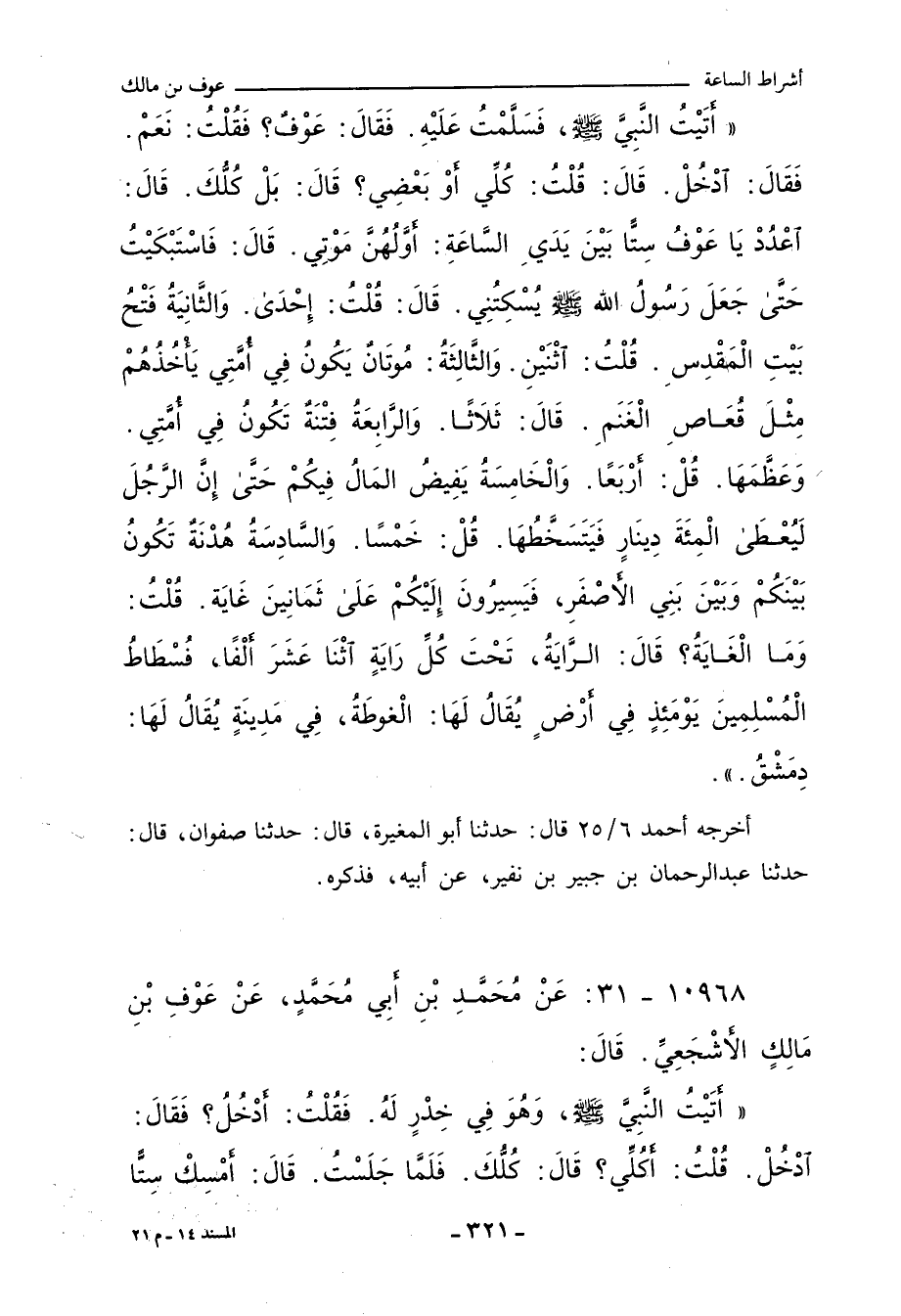 أَتَيْتُ النَّبِيَّ صلى الله عليه وسلم، فَسَلَّمْتُ عَلَيْهِ، فَقَالَ: عَوْفٌ؟ فَقُلْتُ: نَعَمْ، فَقَالَ: ادْخُلْ، قَالَ: قُلْتُ: كُلِّي، أَوْ بَعْضِي؟ قَالَ: بَلْ كُلُّكَ، قَالَ: اعْدُدْ يَا عَوْفُ سِتًّا بَيْنَ يَدَيِ السَّاعَةِ: أَوَّلُهُنَّ مَوْتِي، قَالَ: فَاسْتَبْكَيْتُ حَتَّى جَعَلَ رَسُولُ اللهِ صلى الله عليه وسلم يُسْكِتُنِي، قَالَ: قُلْتُ: إِحْدَى، وَالثَّانِيَةُ فَتْحُ بَيْتِ الْمَقْدِسِ، قُلْتُ: اثْنَيْنِ، وَالثَّالِثَةُ مُوتَانٌ يَكُونُ فِي أُمَّتِي، يَأْخُذُهُمْ مِثْلَ قُعَاصِ الْغَنَمِ، قَالَ: ثَلَاثًا، وَالرَّابِعَةُ فِتْنَةٌ تَكُونُ فِي أُمَّتِي، وَعَظَّمَهَا، قُلْ: أَرْبَعًا، وَالْخَامِسَةُ يَفِيضُ الْمَالُ فِيكُمْ، حَتَّى إِنَّ الرَّجُلَ لَيُعْطَى الْمِئَةَ دِينَارٍ فَيَتَسَخَّطُهَا، قَالَ: خَمْسًا، وَالسَّادِسَةُ هُدْنَةٌ تَكُونُ بَيْنَكُمْ وَبَيْنَ بَنِي الأَصْفَرِ، فَيَسِيرُونَ إِلَيْكُمْ عَلَى ثَمَانِينَ غَايَةً، قُلْتُ: وَمَا الْغَايَةُ؟ قَالَ: الرَّايَةُ، تَحْتَ كُلِّ رَايَةٍ اثْنَا عَشَرَ أَلْفًا، فُسْطَاطُ الْمُسْلِمِينَ يَوْمَئِذٍ فِي أَرْضٍ يُقَالُ لَهَا: الْغُوطَةُ، فِي مَدِينَةٍ يُقَالُ لَهَا: دِمَشْقُ.