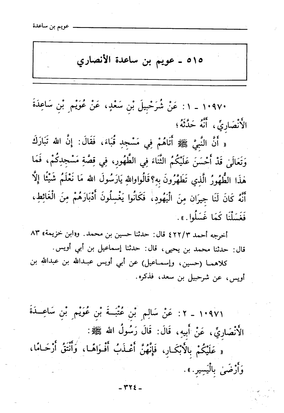 ١٠٩٧٠ - عَنْ شُرَحْبِيلَ بْنِ سَعْدٍ، عَنْ عُوَيْمِ بْنِ سَاعِدَةَ الأَنْصَارِيِّ، أَنَّهُ حَدَّثَهُ؛