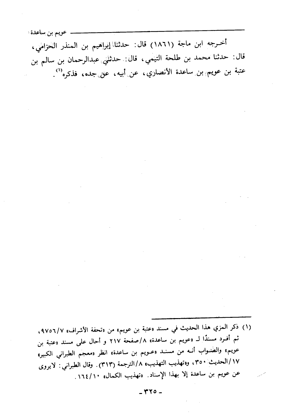 أخرجه ابن ماجة (١٨٦١) قال: حدَّثنا إبراهيم بن المُنْذِر الحِزَامِي، حدَّثنا مُحَمد بن طَلْحَة التَّيْمِي، حدَّثني عَبْد الرَّحْمان بن سالم بن عُتْبَة بن عُوَيْم بن ساعدة الأَنْصَارِيّ، عن أبيه، عن جَدِّه، فذكره.