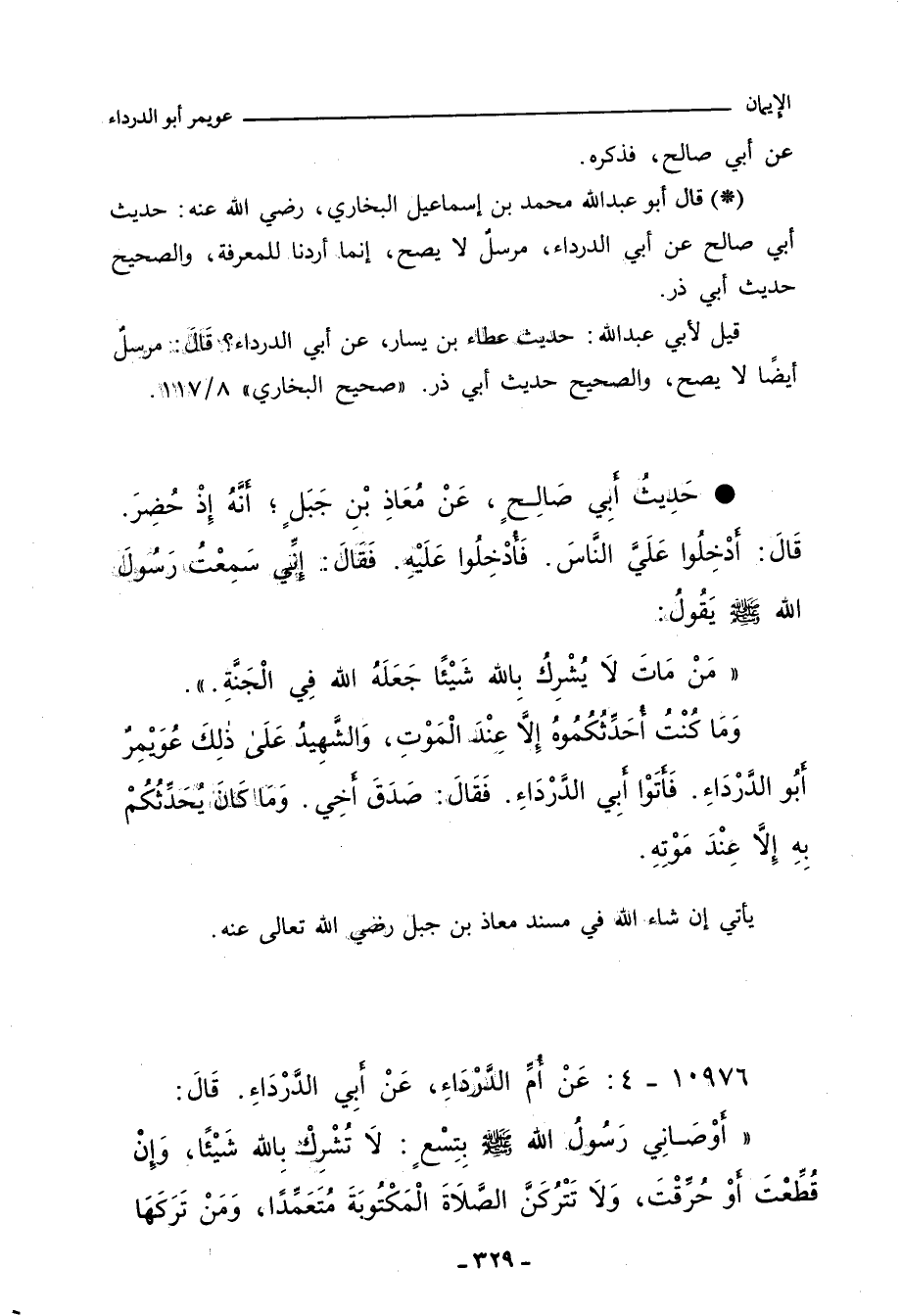 - قال أبو عبد الله البخاري عقب (٦٤٤٣): حديث أبي صالح، عن أبي الدرداء، مرسلٌ لا يصح، إنما أَردنا للمعرفة، والصحيح حديث أَبي ذر.