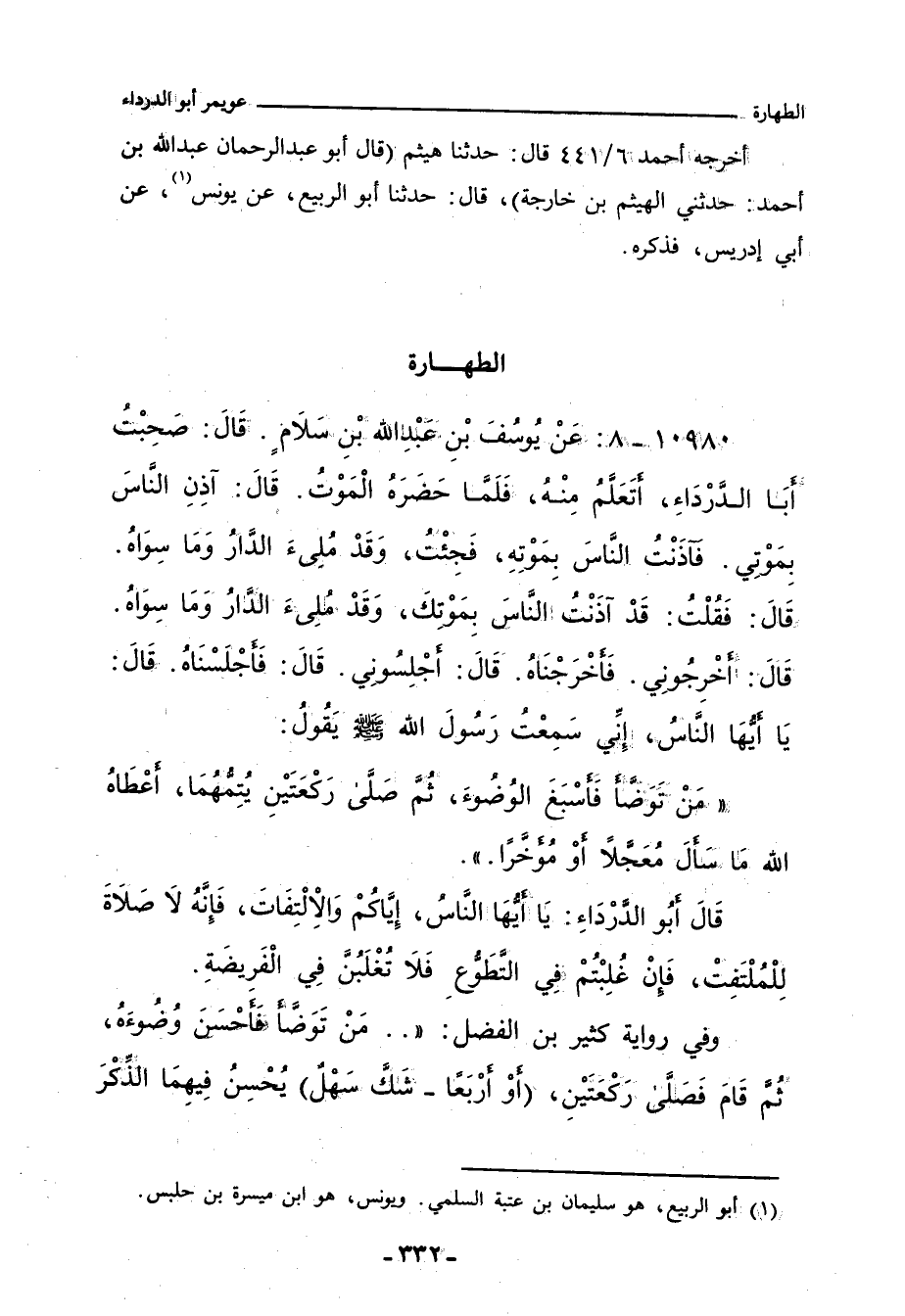 - وفي رواية: عَنْ يُوسُفَ بْنِ عَبْدِ اللهِ بْنِ سَلَامٍ، قَالَ: أَتَيْتُ أَبَا الدَّرْدَاءِ فِي مَرَضِهِ الَّذِي قُبِضَ فِيهِ، فَقَالَ لِي يَا ابْنَ أَخِي، مَا أَعْمَدَكَ إِلَى هَذَا الْبَلَدِ، أَوْ مَا جَاءَ بِكَ؟ قَالَ: قُلْتُ: لَا، إِلَاّ صِلَةُ مَا كَانَ بَيْنَكَ وَبَيْنَ وَالِدِي عَبْدِ اللهِ بْنِ سَلَامٍ، فَقَالَ أَبُو الدَّرْدَاءِ: بِئْسَ سَاعَةُ الْكَذِبِ هَذِهِ، سَمِعْتُ رَسُولَ اللهِ صلى الله عليه وسلم يَقُولُ: