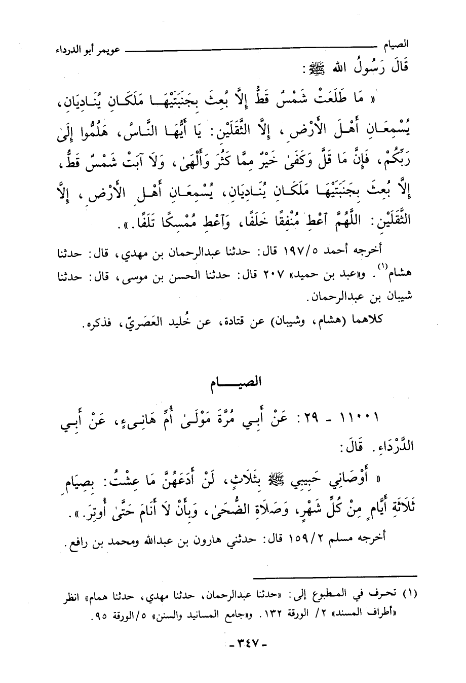 مَا طَلَعَتْ شَمْسٌ قَطُّ إِلَاّ بُعِثَ بِجَنَبَتَيْهَا مَلَكَانِ يُنَادِيَانِ، يُسْمِعَانِ أَهْلَ الأَرْضِ، إِلَاّ الثَّقَلَيْنِ: يَا أَيُّهَا النَّاسُ، هَلُمُّوا إِلَى رَبِّكُمْ، فَإِنَّ مَا قَلَّ وَكَفَى خَيْرٌ مِمَّا كَثُرَ وَأَلْهَى، وَلَا آبَتْ شَمْسٌ قَطُّ، إِلَاّ بُعِثَ بِجَنَبَتَيْهَا مَلَكَانِ يُنَادِيَانِ، يُسْمِعَانِ أَهْلَ الأَرْضِ، إِلَاّ الثَّقَلَيْنِ: اللَّهُمَّ أَعْطِ مُنْفِقًا خَلَفًا، وَأَعْطِ مُمْسِكًا مَالاً تَلَفًا.