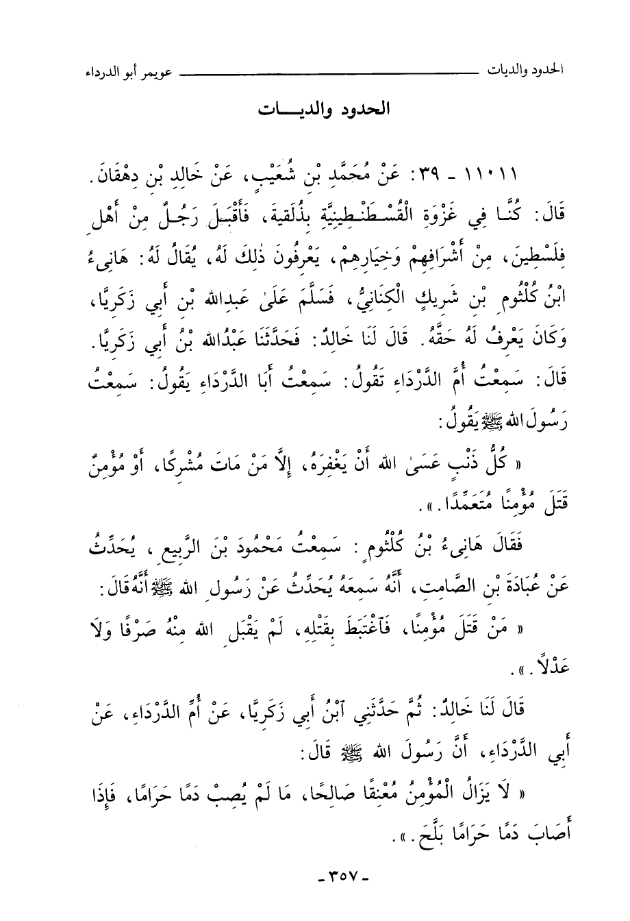 ١١٠١١ - عَنْ عَنْ مُحَمَّدِ بْنِ شُعَيْبٍ، عَنْ خَالِدِ بْنِ دِهْقَانَ، قَالَ: كُنَّا فِي غَزْوَةِ الْقُسْطَنْطِينِيَّةِ بِذُلُقْيَةَ، فَأَقْبَلَ رَجُلٌ مِنْ أَهْلِ فِلَسْطِينَ، مِنْ أَشْرَافِهِمْ وَخِيَارِهِمْ، يَعْرِفُونَ ذَلِكَ لَهُ، يُقَالُ لَهُ: هَانِئُ بْنُ كُلْثُومِ بْنِ شَرِيكٍ الْكِنَانِيُّ، فَسَلَّمَ عَلَى عَبْدِ اللهِ بْنِ أَبِي زَكَرِيَّا، وَكَانَ يَعْرِفُ لَهُ حَقَّهُ، قَالَ لَنَا خَالِدٌ: فَحَدَّثَنَا عَبْدُ اللهِ بْنُ أَبِي زَكَرِيَّا، قَالَ: سَمِعْتُ أُمَّ الدَّرْدَاءِ تَقُولُ: سَمِعْتُ أَبَا الدَّرْدَاءِ يَقُولُ: سَمِعْتُ رَسُولَ اللهِ صلى الله عليه وسلم يَقُولُ: