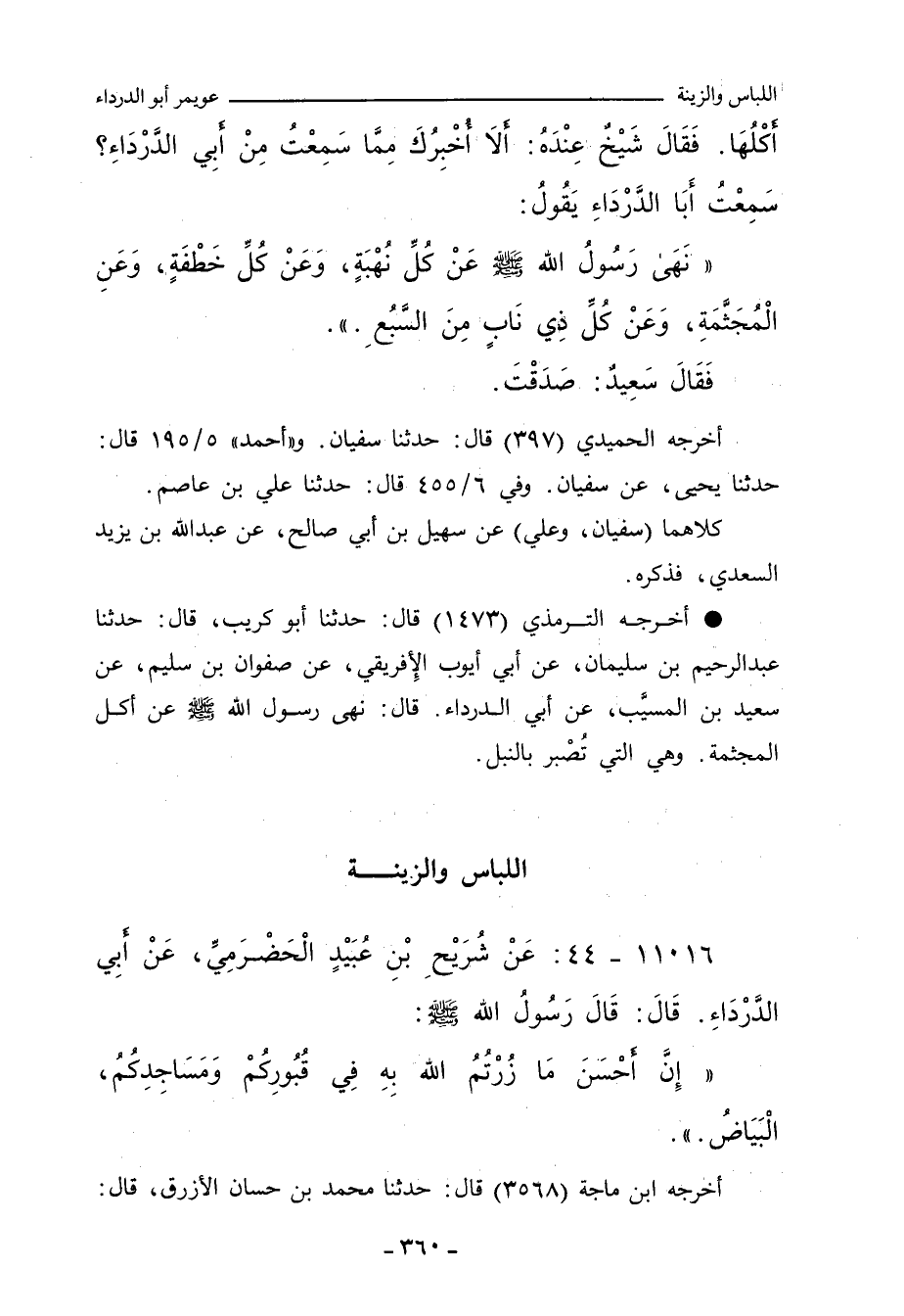 - وفي رواية: عَنْ عَبْدِ اللهِ بْنِ يَزِيدَ السَّعْدِيِّ، قَالَ: أَمَرَنِي نَاسٌ مِنْ قَوْمِي أَنْ أَسْأَلَ سَعِيدَ بْنَ الْمُسَيَّبِ عَنْ سِنَانٍ يُحَدِّدُونَهُ وَيُرَكِّزُونَهُ فِي الأَرْضِ، فَيُصْبِحُ وَقَدْ قَتَلَ الضَّبُعَ، أَتُرَاهُ ذَكَاتَهُ؟ قَالَ: فَجَلَسْتُ إِلَى سَعِيدِ بْنِ الْمُسَيَّبِ، فَإِذَا عِنْدَهُ شَيْخٌ أَبْيَضُ الرَّأْسِ وَاللِّحْيَةِ، مِنْ أَهْلِ الشَّامِ، فَسَأَلْتُهُ عَنْ ذَلِكَ، فَقَالَ لِي: وَإِنَّكَ لَتَأْكُلُ الضَّبُعَ؟ قَالَ: قُلْتُ: مَا أَكَلْتُهَا قَطُّ، وَإِنَّ نَاسًا مِنْ قَوْمِي لَيَأْكُلُونَهَا، قَالَ: فَقَالَ: إِنَّ أَكْلَهَا لَا يَحِلُّ، قَالَ: فَقَالَ الشَّيْخُ: يَا عَبْدَ اللهِ، أَلَا أُحَدِّثُكَ بِحَدِيثٍ سَمِعْتُهُ مِنْ أَبِي الدَّرْدَاءِ، يَرْوِيهِ عَنِ النَّبِيِّ صلى الله عليه وسلم؟ قَالَ: قُلْتُ: بَلَى، قَالَ: فَإِنِّي سَمِعْتُ أَبَا الدَّرْدَاءِ يَقُولُ:
