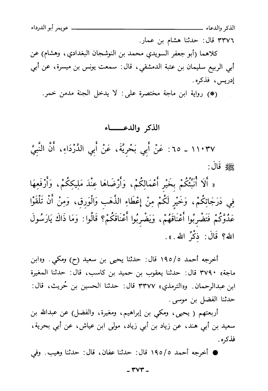 أَلَا أُنَبِّئُكُمْ بِخَيْرِ أَعْمَالِكُمْ وَأَرْضَاهَا عِنْدَ مَلِيكِكُمْ، وَأَرْفَعِهَا فِي دَرَجَاتِكُمْ، وَخَيْرٍ لَكُمْ مِنْ إِعْطَاءِ الذَّهَبِ وَالْوَرِقِ، وَمِنْ أَنْ تَلْقَوْا عَدُوَّكُمْ فَتَضْرِبُوا أَعْنَاقَهُمْ، وَيَضْرِبُوا أَعْنَاقَكُمْ؟ قَالُوا: وَمَا ذَاكَ يَا رَسُولَ اللهِ؟ قَالَ: ذِكْرُ اللهِ.