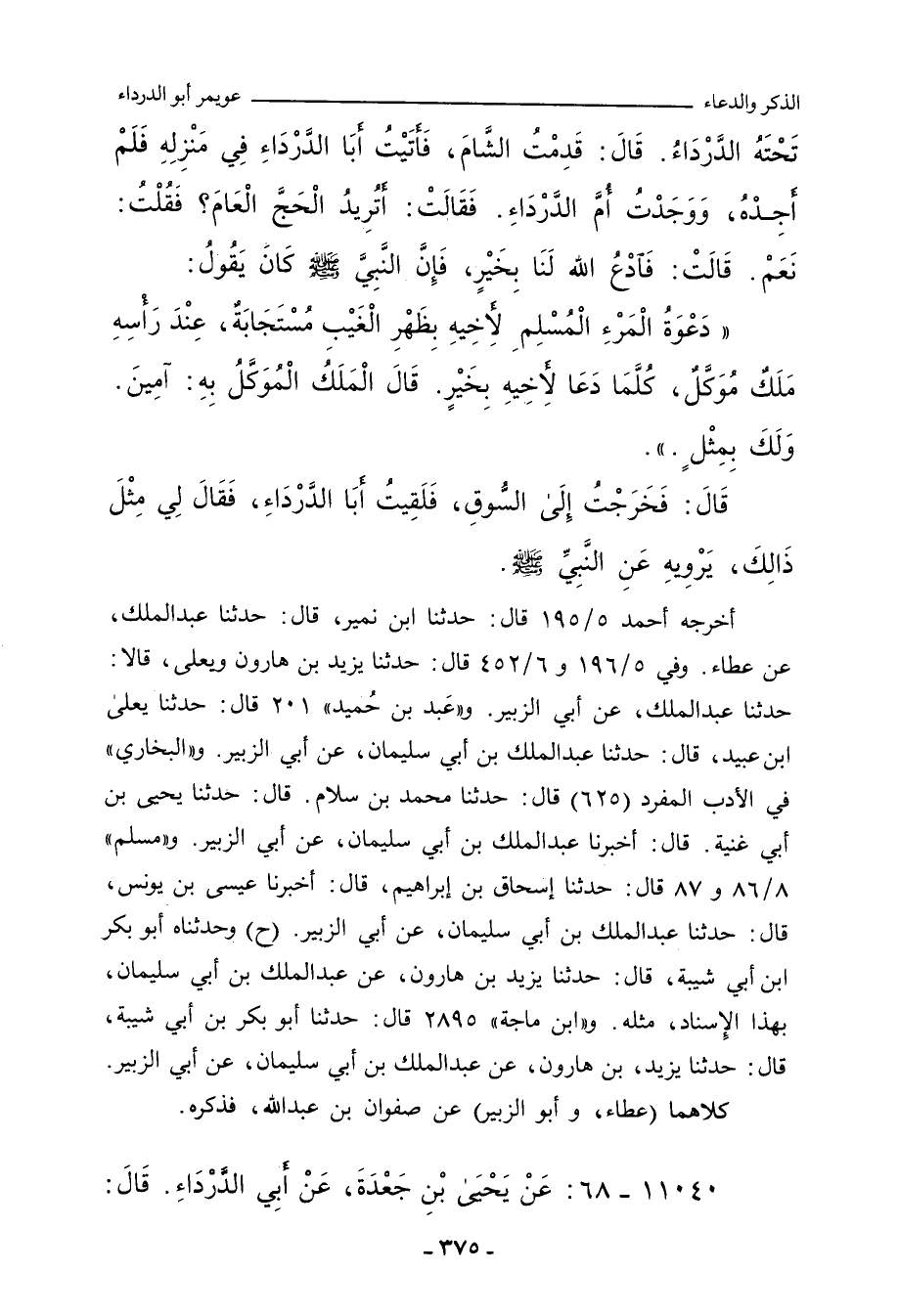 تَحْتَهُ الدَّرْدَاءُ، قَالَ: قَدِمْتُ الشَّامَ، فَأَتَيْتُ أَبَا الدَّرْدَاءِ فِي مَنْزِلِهِ فَلَمْ أَجِدْهُ، وَوَجَدْتُ أُمَّ الدَّرْدَاءِ، فَقَالَتْ: أَتُرِيدُ الْحَجَّ الْعَامَ؟ فَقُلْتُ: نَعَمْ، قَالَتْ: فَادْعُ اللهَ لَنَا بِخَيْرٍ، فَإِنَّ النَّبِيَّ صلى الله عليه وسلم كَانَ يَقُولُ: