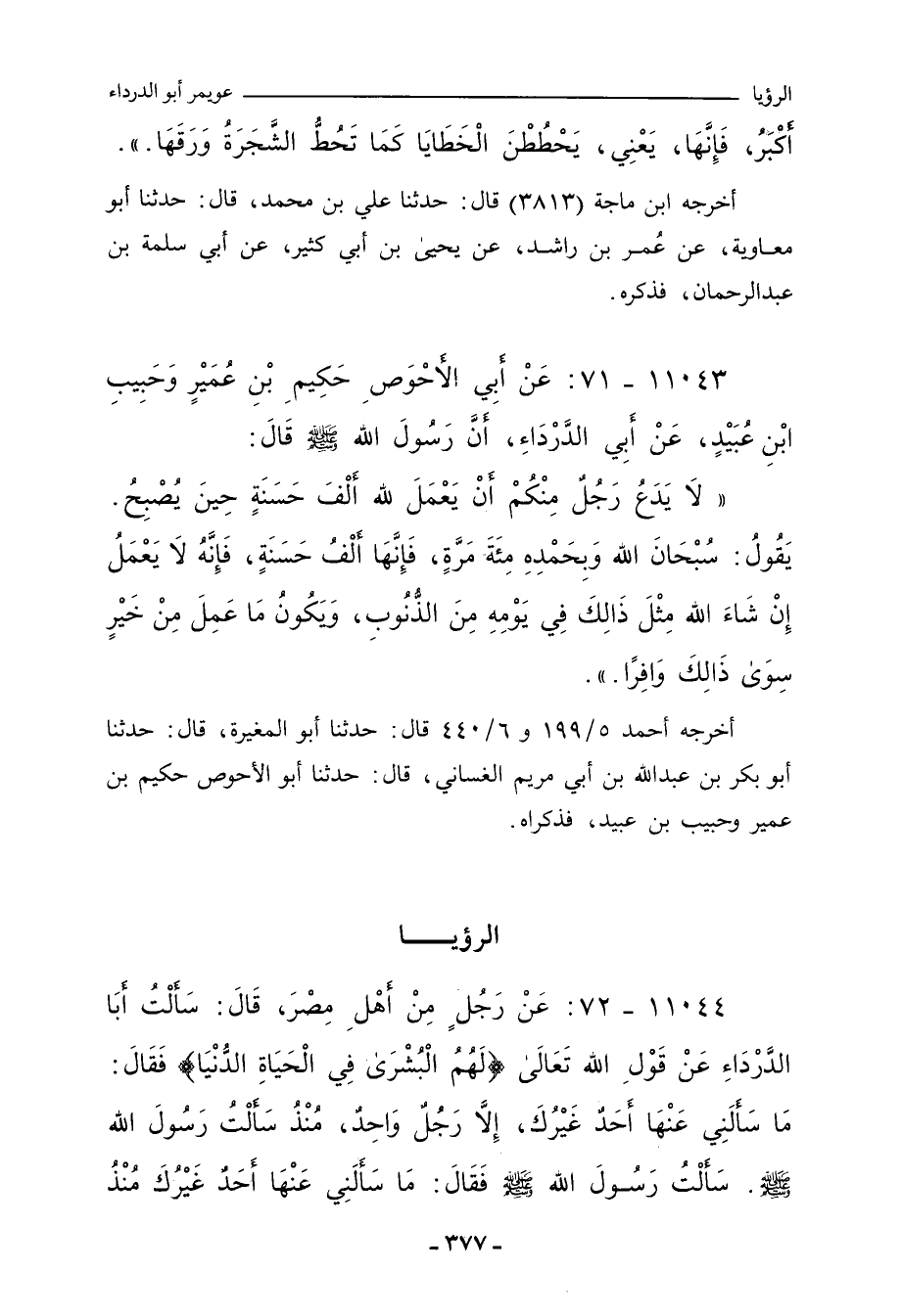 ١١٠٤٤ - عَنْ رَجُلٍ مِنْ أَهْلِ مِصْرَ، قَالَ: سَأَلْتُ أَبَا الدَّرْدَاءِ عَنْ قَوْلِ اللهِ تَعَالَى: {لَهُمُ الْبُشْرَى فِي الْحَيَاةِ الدُّنْيَا} فَقَالَ: مَا سَأَلَنِي عَنْهَا أَحَدٌ غَيْرَكَ، إِلَاّ رَجُلٌ وَاحِدٌ، مُنْذُ سَأَلْتُ رَسُولَ اللهِ صلى الله عليه وسلم، سَأَلْتُ رَسُولَ اللهِ صلى الله عليه وسلم، فَقَالَ: مَا سَأَلَنِي عَنْهَا أَحَدٌ غَيْرَكَ مُنْذُ