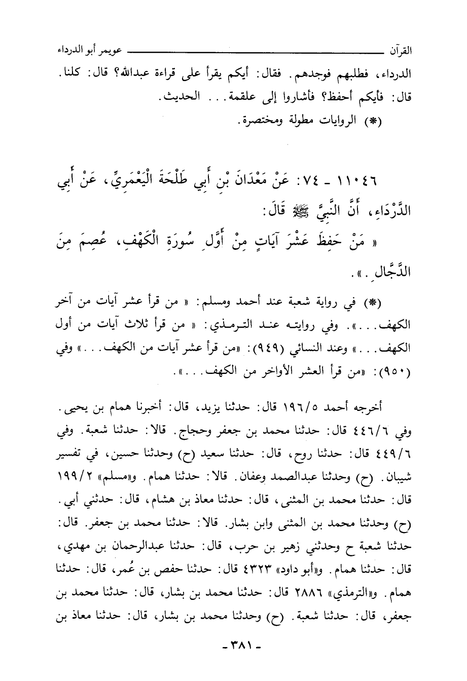 - وفي رواية: مَنْ قَرَأَ عَشْرَ آيَاتٍ مِنْ سُورَةِ الْكَهْفِ، عُصِمَ مِنْ فِتْنَةِ الدَّجَّالِ. حب (٧٨٥)