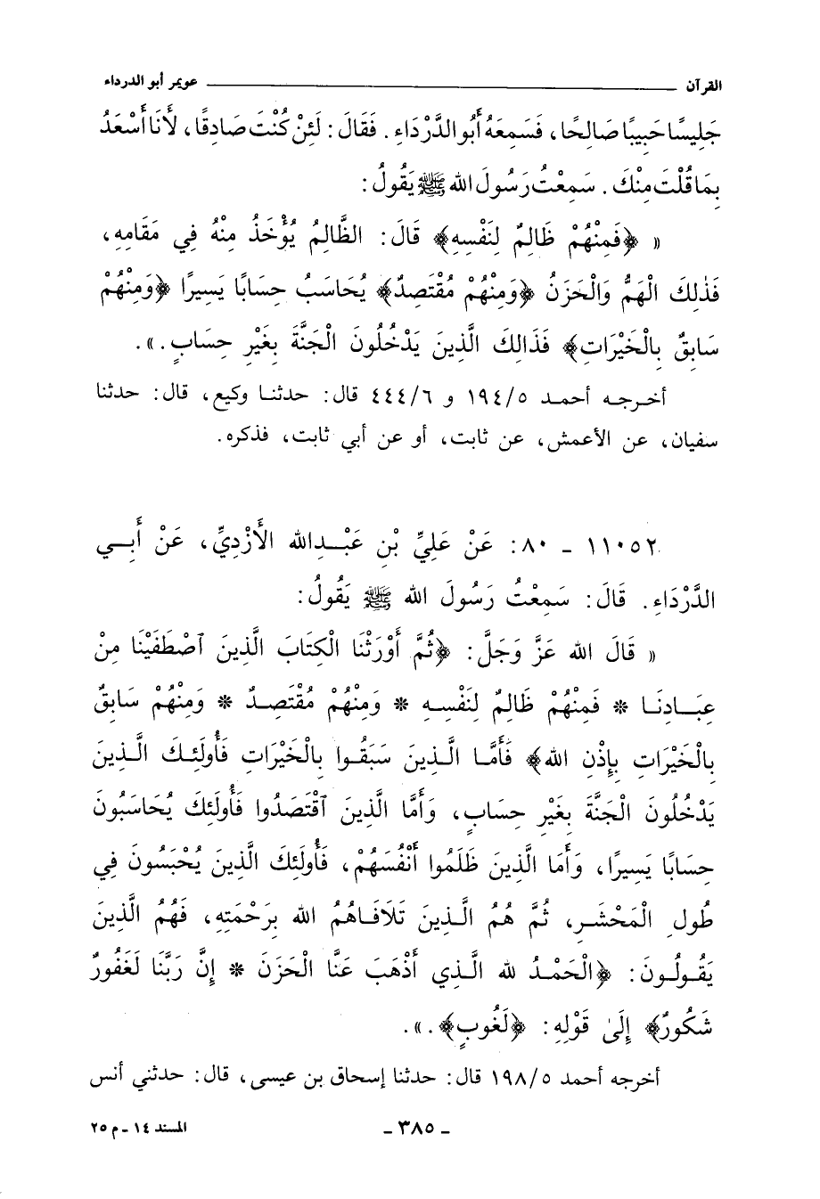 قَالَ اللهُ، عَزَّ وَجَلَّ: {ثُمَّ أَوْرَثْنَا الْكِتَابَ الَّذِينَ اصْطَفَيْنَا مِنْ عِبَادِنَا فَمِنْهُمْ ظَالِمٌ لِنَفْسِهِ وَمِنْهُمْ مُقْتَصِدٌ وَمِنْهُمْ سَابِقٌ بِالْخَيْرَاتِ بِإِذْنِ اللهِ} فَأَمَّا الَّذِينَ سَبَقُوا بِالْخَيْرَاتِ، فَأُولَئِكَ الَّذِينَ يَدْخُلُونَ الْجَنَّةَ بِغَيْرِ حِسَابٍ، وَأَمَّا الَّذِينَ اقْتَصَدُوا، فَأُولَئِكَ يُحَاسَبُونَ حِسَابًا يَسِيرًا، وَأَمَّا الَّذِينَ ظَلَمُوا أَنْفُسَهُمْ، فَأُولَئِكَ الَّذِينَ يُحْبَسُونَ فِي طُولِ الْمَحْشَرِ، ثُمَّ هُمُ الَّذِينَ تَلَافَاهُمُ اللهُ بِرَحْمَتِهِ، فَهُمُ الَّذِينَ يَقُولُونَ: {الْحَمْدُ ِللهِ الَّذِي أَذْهَبَ عَنَّا الْحَزَنَ إِنَّ رَبَّنَا لَغَفُورٌ شَكُورٌ} إِلَى قَوْلِهِ: {لُغُوبٌ}.
