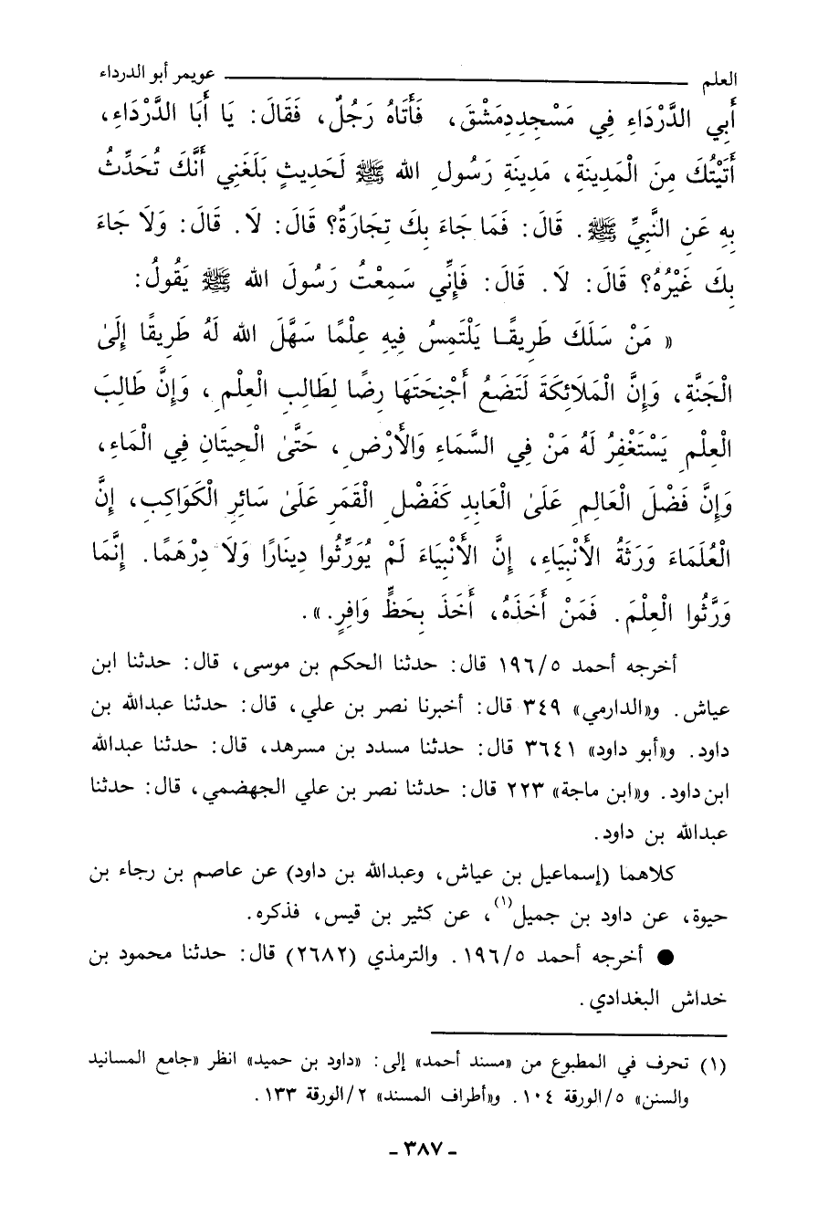 أَبِي الدَّرْدَاءِ فِي مَسْجِدِ دِمَشْقَ، فَأَتَاهُ رَجُلٌ، فَقَالَ: يَا أَبَا الدَّرْدَاءِ، أَتَيْتُكَ مِنَ الْمَدِينَةِ، مَدِينَةِ رَسُولِ اللهِ صلى الله عليه وسلم، لِحَدِيثٍ بَلَغَنِي أَنَّكَ تُحَدِّثُ بِهِ، عَنِ النَّبِيِّ صلى الله عليه وسلم، قَالَ: فَمَا جَاءَ بِكَ تِجَارَةٌ؟ قَالَ: لَا، قَالَ: وَلَا جَاءَ بِكَ غَيْرُهُ؟ قَالَ: لَا، قَالَ: فَإِنِّي سَمِعْتُ رَسُولَ اللهِ صلى الله عليه وسلم يَقُولُ: