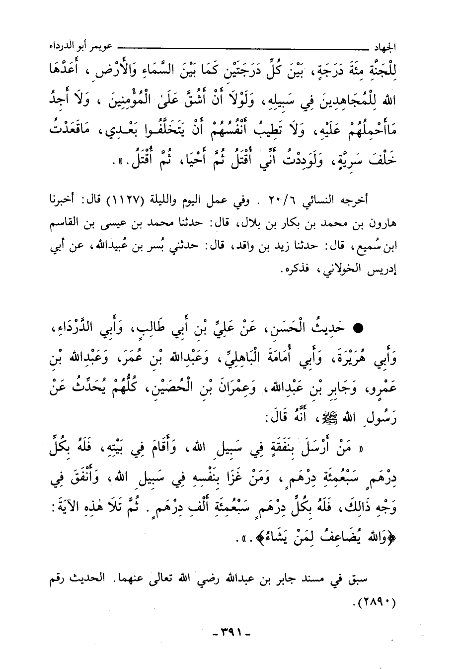 لِلْجَنَّةِ مِئَةَ دَرَجَةٍ، بَيْنَ كُلِّ دَرَجَتَيْنِ كَمَا بَيْنَ السَّمَاءِ وَالأَرْضِ، أَعَدَّهَا اللهُ لِلْمُجَاهِدِينَ فِي سَبِيلِهِ، وَلَوْلَا أَنْ أَشُقَّ عَلَى الْمُؤْمِنِينَ، وَلَا أَجِدُ مَا أَحْمِلُهُمْ عَلَيْهِ، وَلَا تَطِيبُ أَنْفُسُهُمْ أَنْ يَتَخَلَّفُوا بَعْدِي، مَا قَعَدْتُ خَلْفَ سَرِيَّةٍ، وَلَوَدِدْتُ أَنِّي أُقْتَلُ، ثُمَّ أُحْيَا، ثُمَّ أُقْتَلُ.