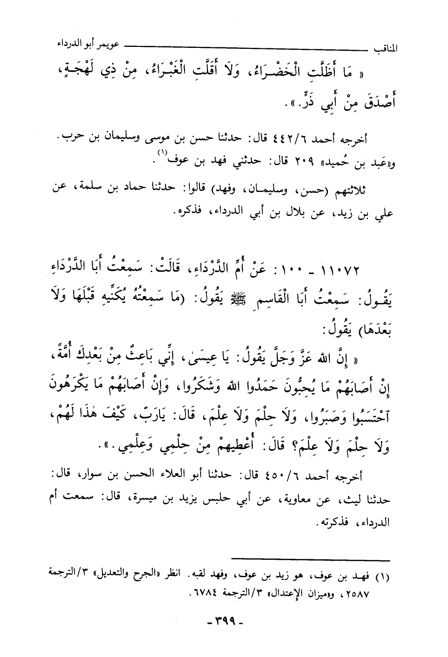 ثلاثتهم (حسن، وسليمان، وفهد) قالوا: حدثنا حماد بن سلمة، عن علي بن زيد بن جدعان، عن بلال بن أبي الدرداء، فذكره.