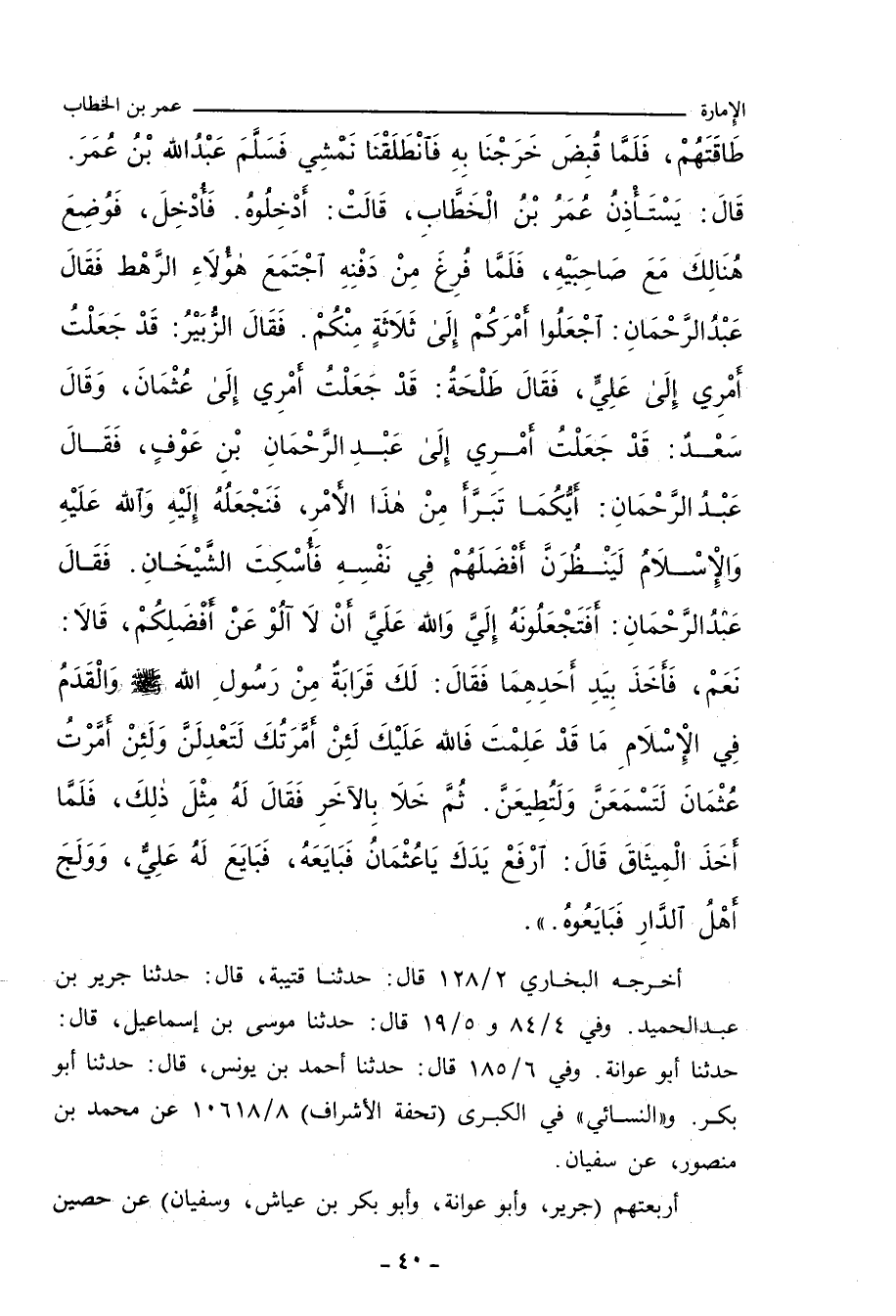 - وفي رواية: عَنْ عَمْرِو بْنِ مَيْمُونٍ، عَنْ عُمَرَ بْنِ الْخَطَّابِ، قَالَ: لَمَّا أُصِيبَ، قَالَ لَهُ عَبْدُ اللهِ بْنُ عُمَرَ: أَلَا تَسْتَخْلِفُ يَا أَمِيرَ الْمُؤْمِِنِينَ؟ قَالَ: مَا أَجِدُ أَحَدًا أَحَقَّ بِهَذَا الأَمْرِ مِنْ هَؤُلَاءِ الَّذِينَ تُوُفِّيَ رَسُولُ اللهِ صلى الله عليه وسلم وَهُوَ عَنْهُمْ رَاضٍ، فَسَمَّى عَلِيًّا، وَعُثْمَانَ، وَطَلْحَةَ، وَالزُّبَيْرَ، وَعَبْدَ الرَّحْمَانِ بْنَ عَوْفٍ، وَسَعْدَ بْنَ أَبِي وَقَاصٍ، وَقَالَ: لِيَشْهَدُهُمْ عَبْدُ اللهِ بْنُ عُمَرَ، وَلَيْسَ لَهُ مِنَ الأَمْرِ شَيْءٌ، فَمَنْ اسْتَخْلَفُوهُ فَهُوَ الْخَلِيفَةُ بَعْدِي، فَإِْنَ أَصَابَتْ سَعْدًا، وَإِلَاّ فَلْيَسْتَعِنْ بِهِ الْخَلِيفَةُ بَعْدِي، فَإِنِّي لَمْ أَنْزَعْهُ مِنْ ضَعْفٍ وَلَا خِيَانَةٍ. عل (٢٠٥)
