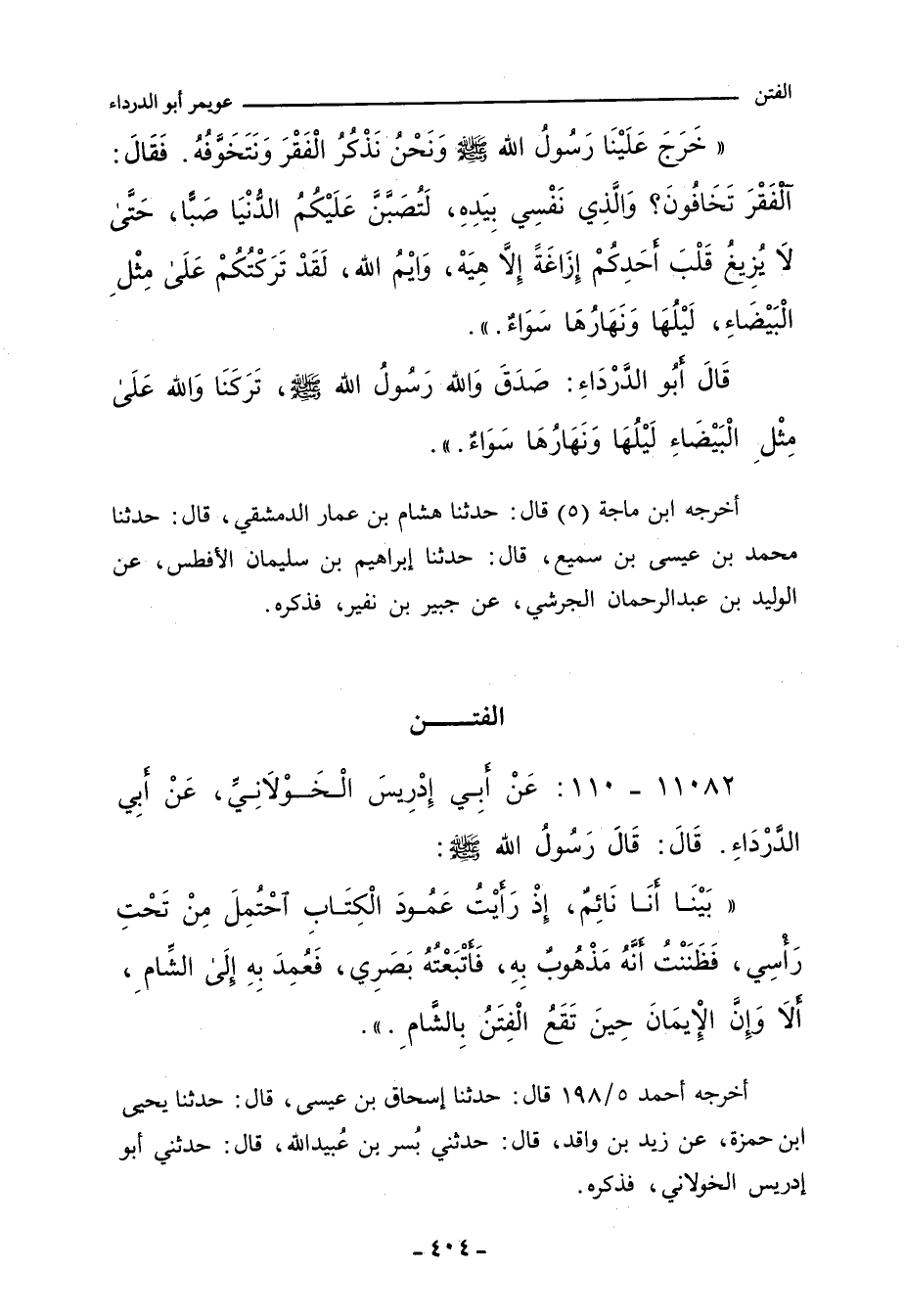 قَالَ أَبُو الدَّرْدَاءِ: صَدَقَ وَاللهِ رَسُولُ اللهِ صلى الله عليه وسلم، تَرَكَنَا وَاللهِ عَلَى مِثْلِ الْبَيْضَاءِ، لَيْلُهَا وَنَهَارُهَا سَوَاءٌ.